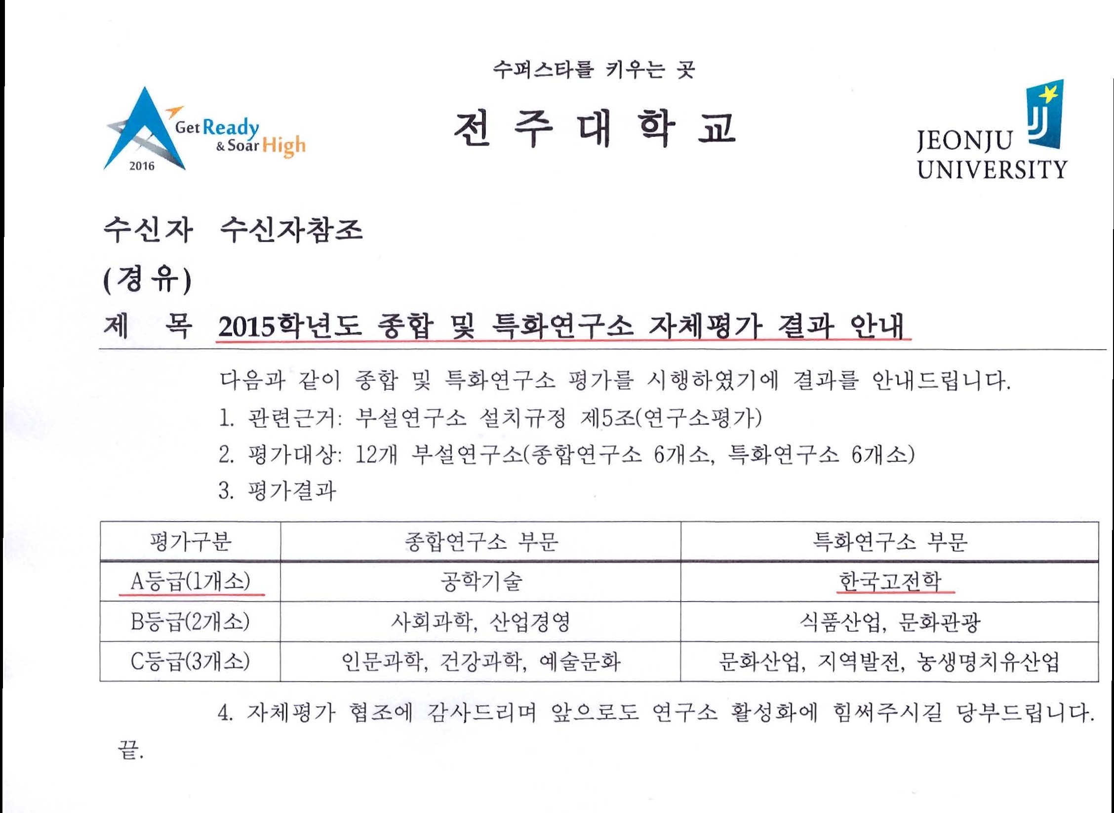 한국고전학연구소 2015연구소자체평가 'A등급' 선정