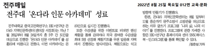 | 650 | 기타 | 전주대 '온다라 인문 아카데미' 성료 | 온다라 지역인문학센터 | 23-01-17 | 274 |