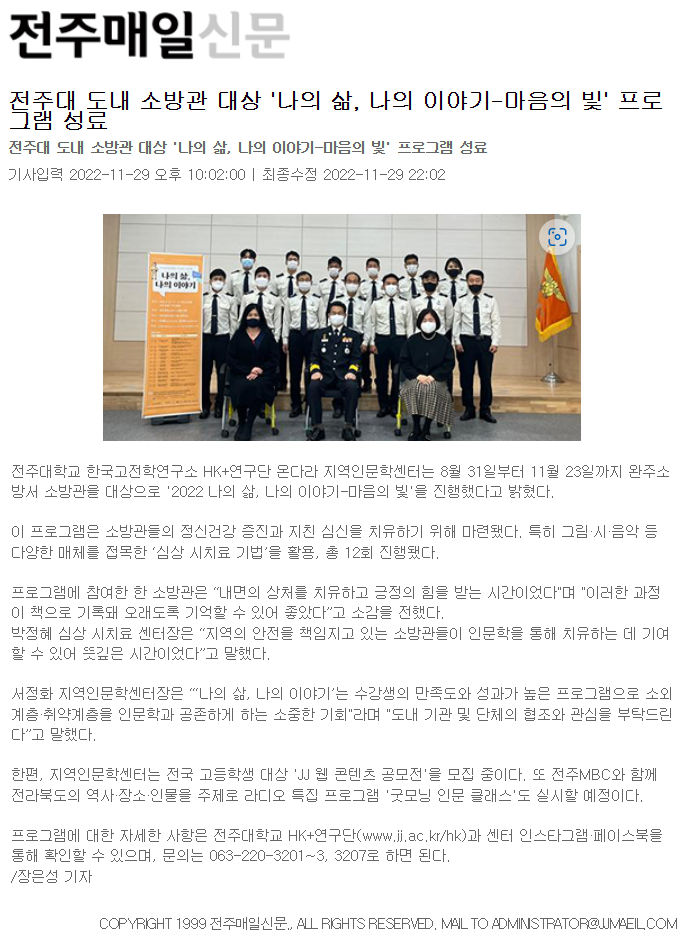 | 652 | 기타 | 전주대 도내 소방관 대상 '나의 삶, 나의 이야기-마음의 빛' 프로그램 성료 | 온다라 지역인문학센터 | 23-01-17 | 285 |