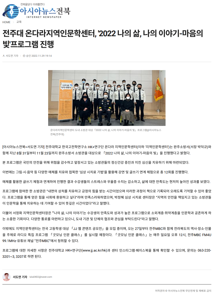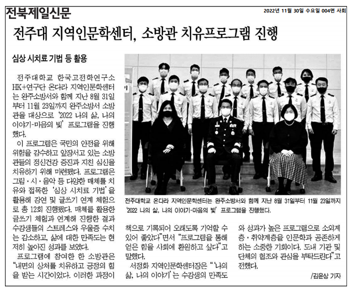 전주대 온다라지역인문학센터 도내 소방관 대상「2022 나의 삶, 나의 이야기-마음의 빛」프로그램
