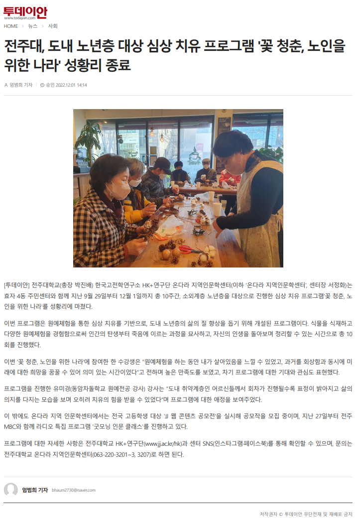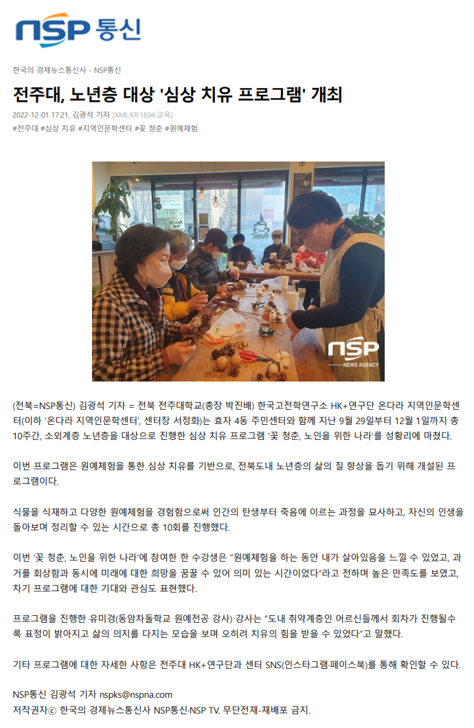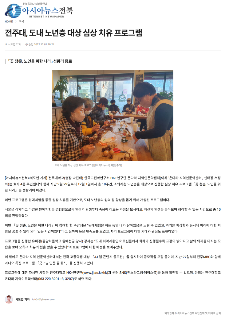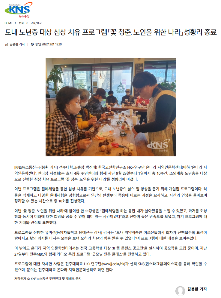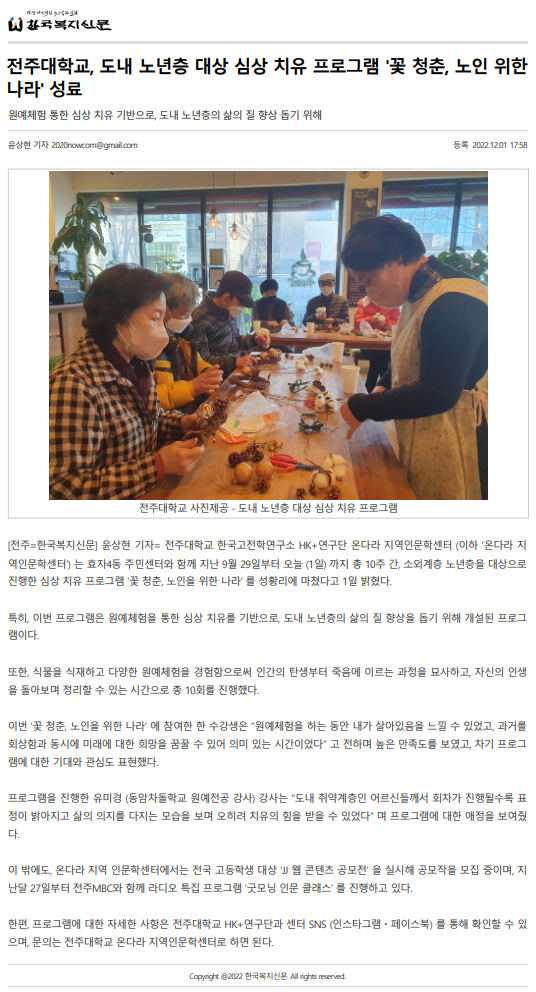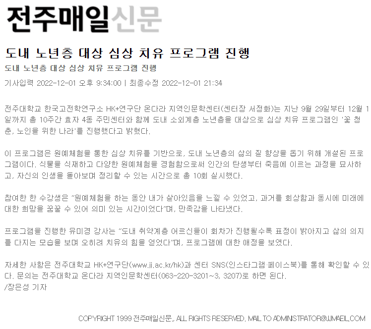 | 643 | 기타 | 전주대, 노년층 대상 '심상 치유 프로그램' 개최 | 온다라 지역인문학센터 | 22-12-28 | 236 |