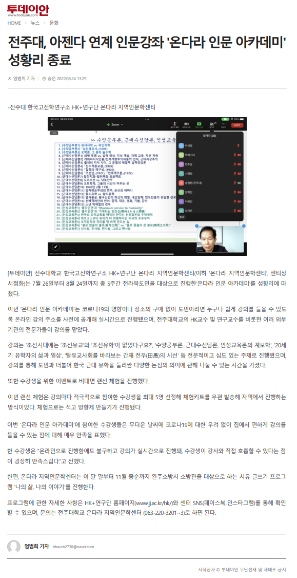 599 기타 전주대, 아젠다 연계 인문강좌 '온다라 인문 아카데미' 성황리 종료 온다라 지역인문학센터 22-09-07 213   220824_전주대, 아젠다 연계 인문강좌 '온다라 인문 아카데미' 성황리 종료_투데이안.png