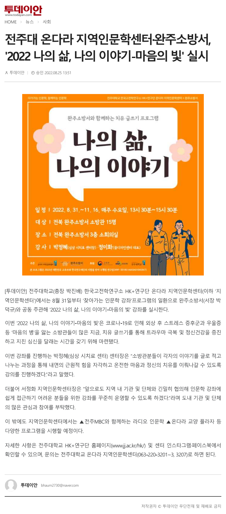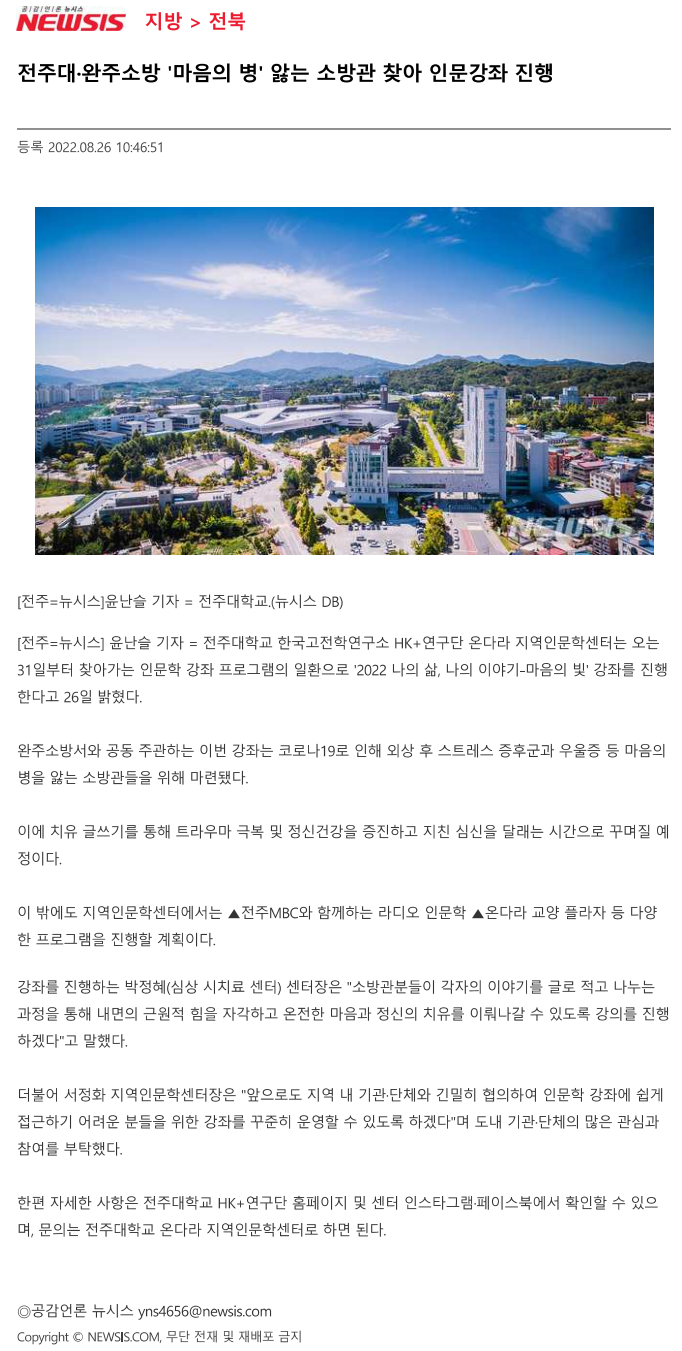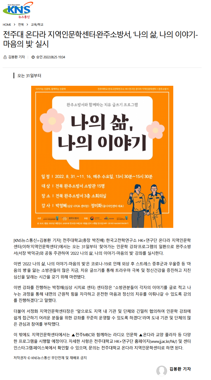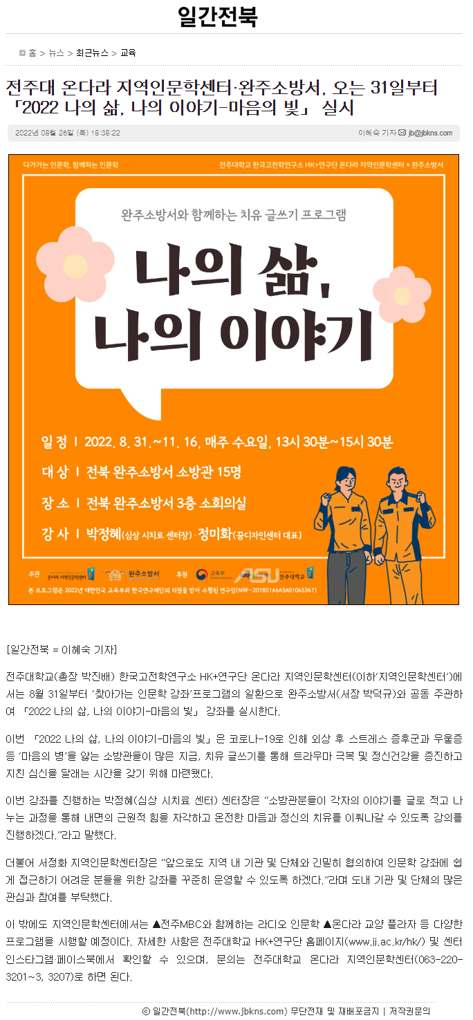 603 기타 전주대 온다라 지역인문학센터·완주소방서, 오는 31일부터 「2022 나의 삶, 나의 이야기-마음의 빛」 실시 온다라 지역인문학센터 22-09-07 204   220825_전주대 온다라 지역인문학센터·완주소방서, 오는 31일부터 「2022 나의 삶, 나의 이야기-마음의 빛」 실시_일간전북.png
