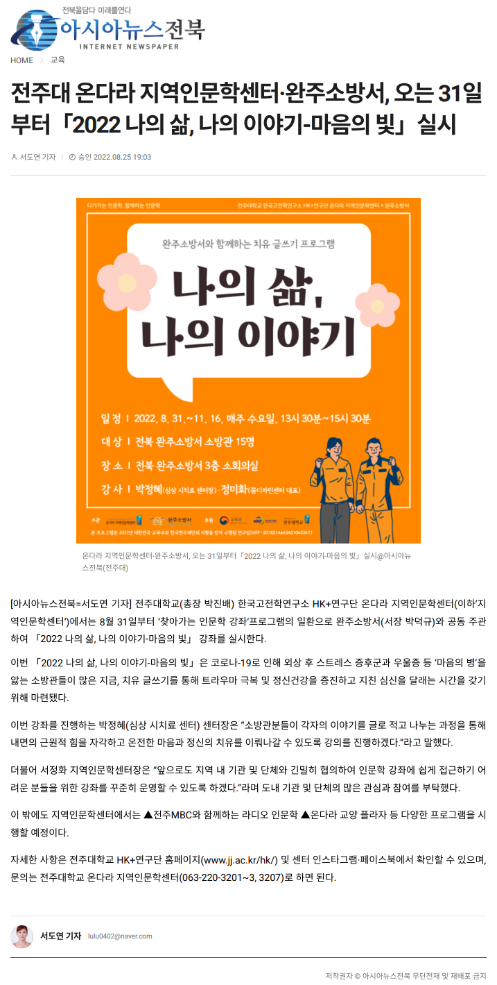602 기타 전주대 온다라 지역인문학센터·완주소방서, 오는 31일부터 「2022 나의 삶, 나의 이야기-마음의 빛」 실시 온다라 지역인문학센터 22-09-07 213   220825_전주대 온다라 지역인문학센터·완주소방서, 오는 31일부터 「2022 나의 삶, 나의 이야기-마음의 빛」 실시_아시아뉴스전북.png