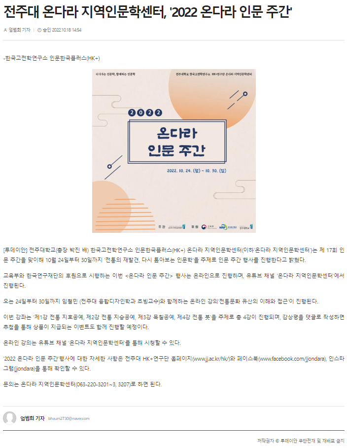 608 기타 전주대 온다라 지역인문학센터, '2022 온다라 인문 주간' 온다라 지역인문학센터 22-11-10 202   221018_전주대 온다라 지역인문학센터, '2022 온다라 인문 주간'_투데이안.PNG