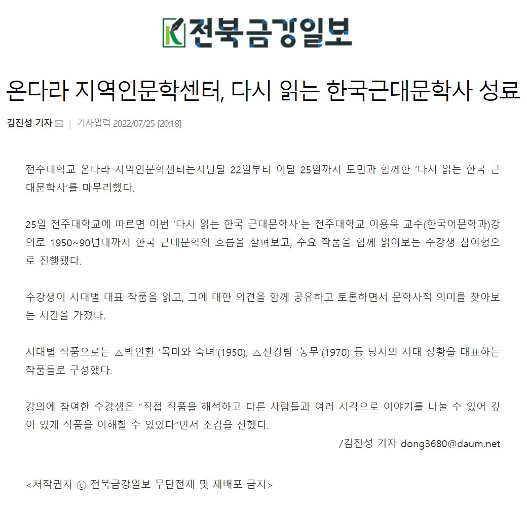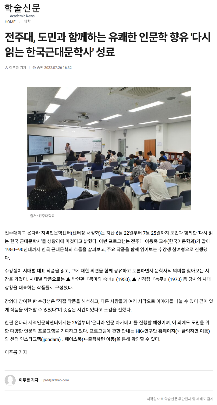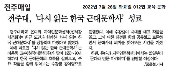 | 592 | 기타 | 전주대학교 온다라 지역인문학센터 '다시 읽는 한국 근대문학사' 마무리 | 온다라 지역인문학센터 | 22-08-17 | 208 |