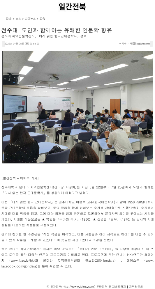 | 591 | 기타 | 전주대, 도민과 함께하는 유쾌한 인문학 향유 '다시 읽는 한국근대문학사' 성료 | 온다라 지역인문학센터 | 22-08-17 | 193 |
