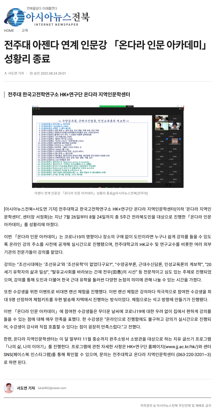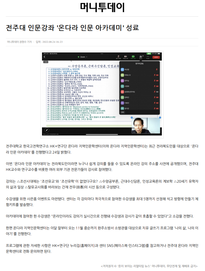 | 597 | 기타 | 전주대 인문강좌 '온다라 인문 아카데미' 성료 | 온다라 지역인문학센터 | 22-09-07 | 217 |