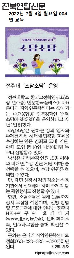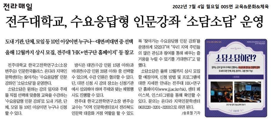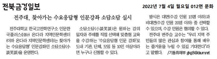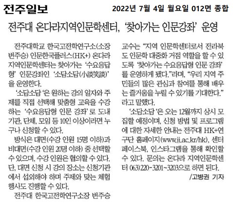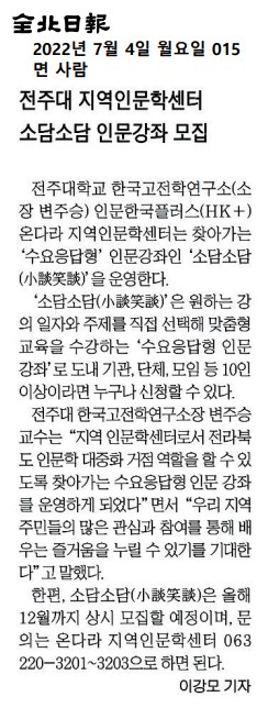 | 576 | 기타 | 전주대, 찾아가는 수요응답형 인문강좌 소담소담 실시 | 온다라 지역인문학센터 | 22-08-17 | 193 |