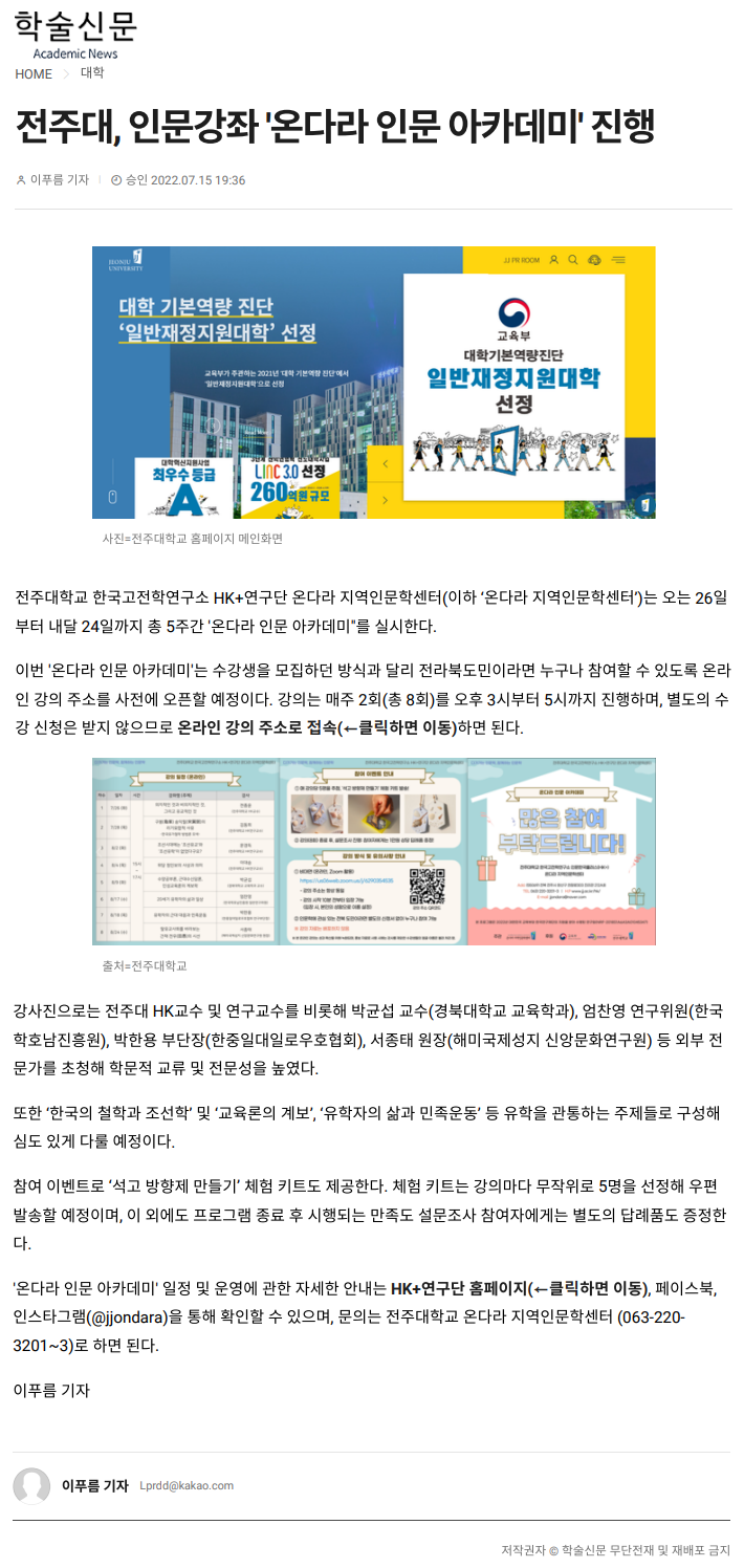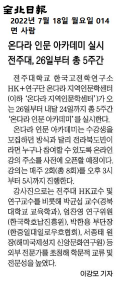 | 578 | 기타 | 온다라 인문 아카데미 실시 전주대, 26일부터 총 5주간 | 온다라 지역인문학센터 | 22-08-17 | 190 |
