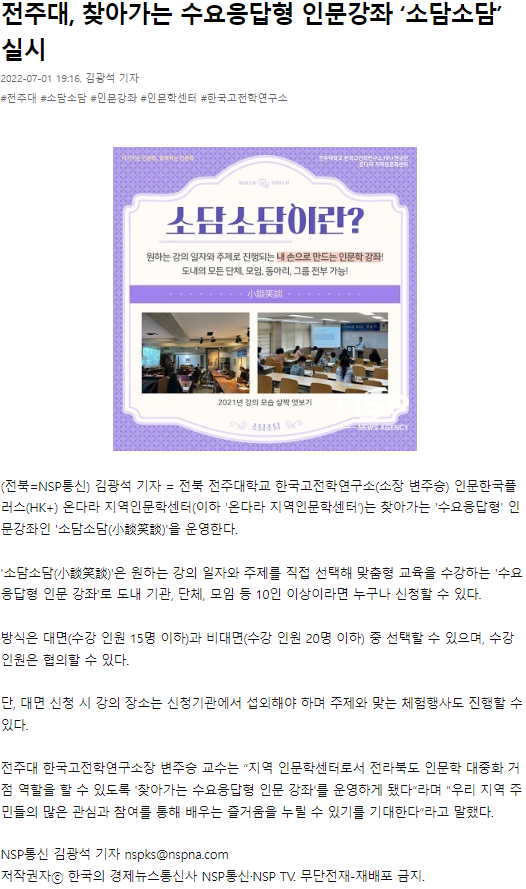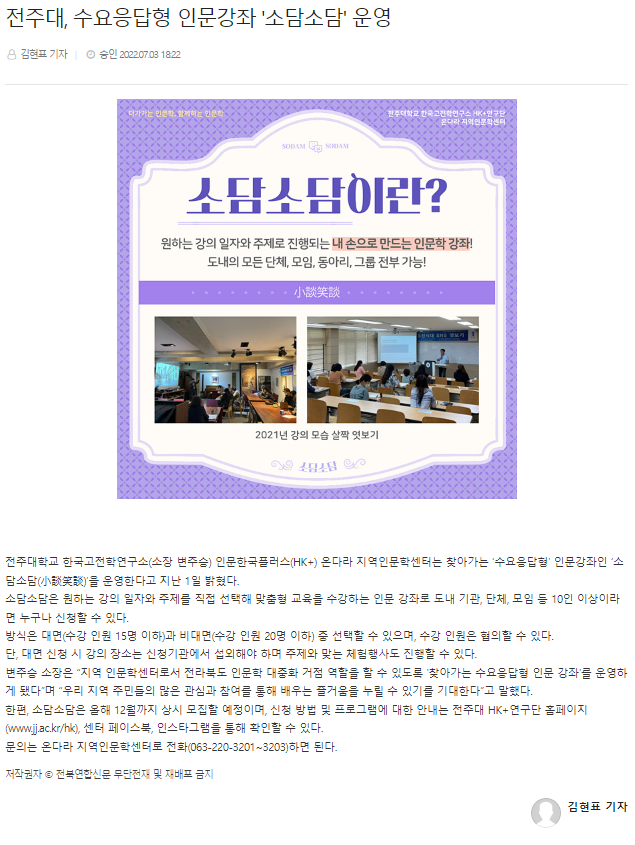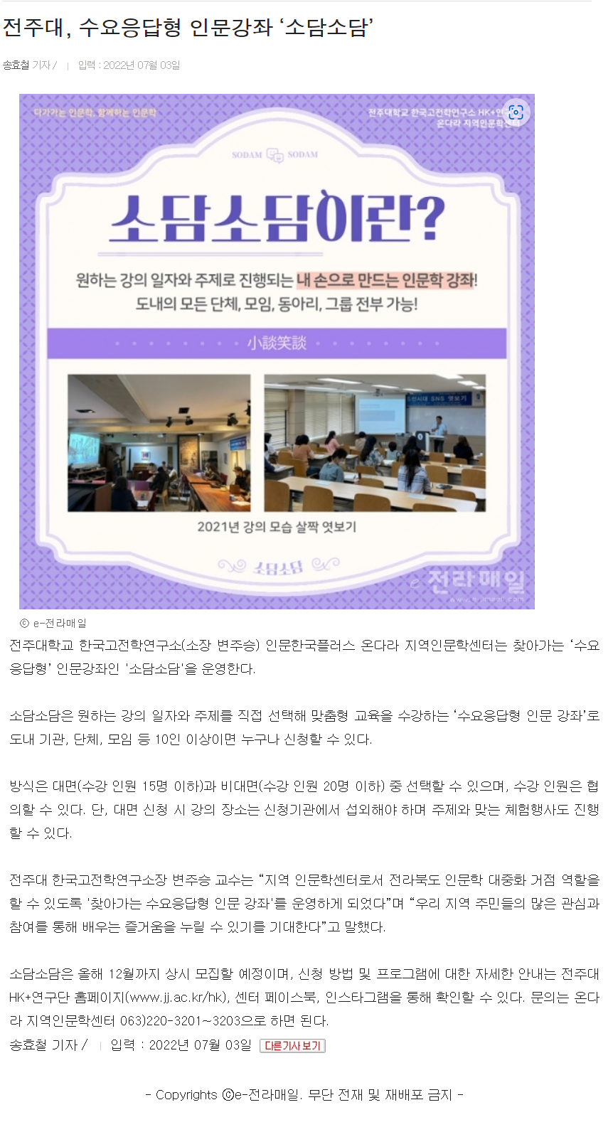 | 553 | 기타 | 전주대, 찾아가는 수요응답형 인문강좌 ‘소담소담(小談笑談)’ 실시 | 온다라 지역인문학센터 | 22-07-04 | 199 |