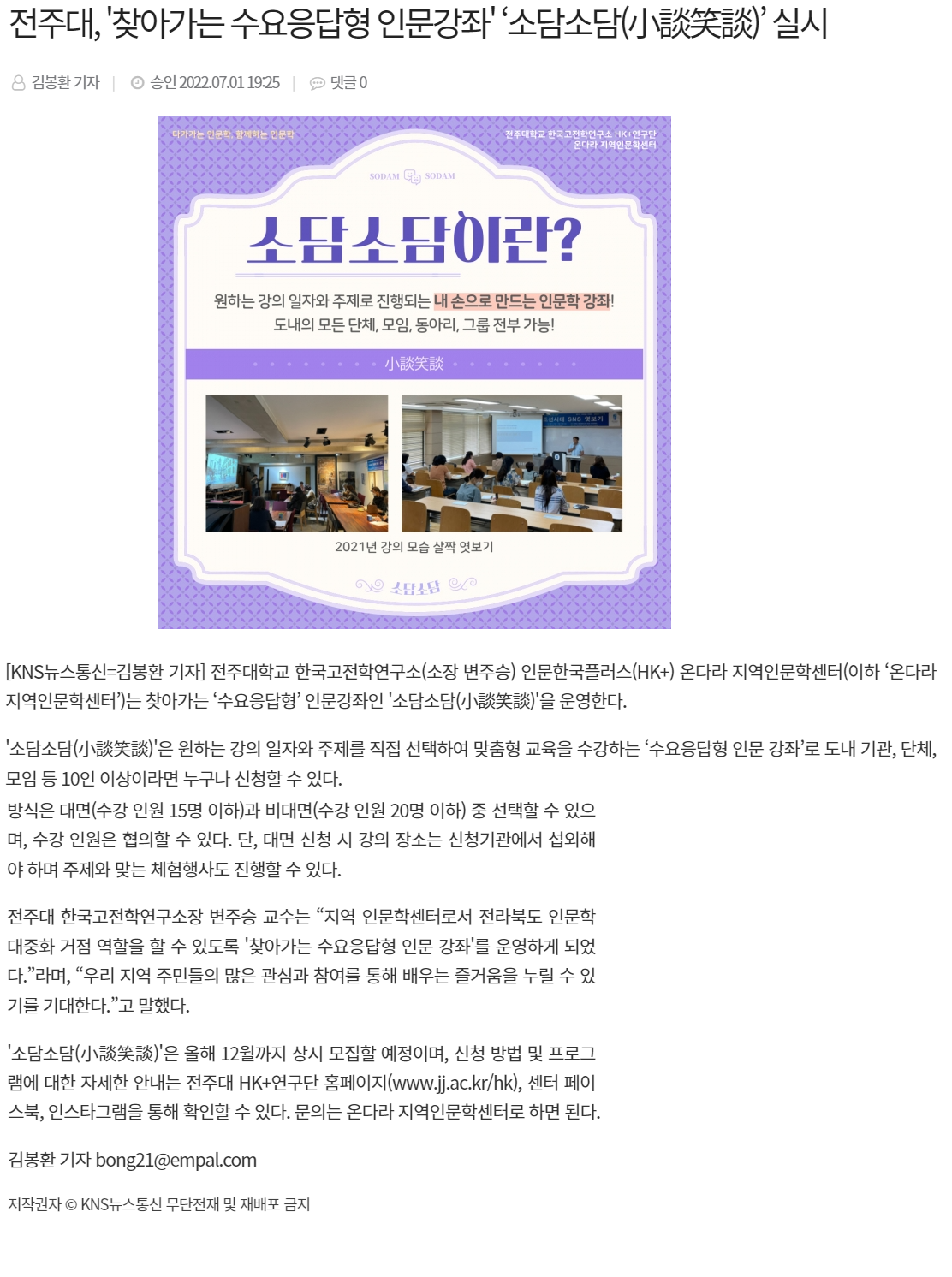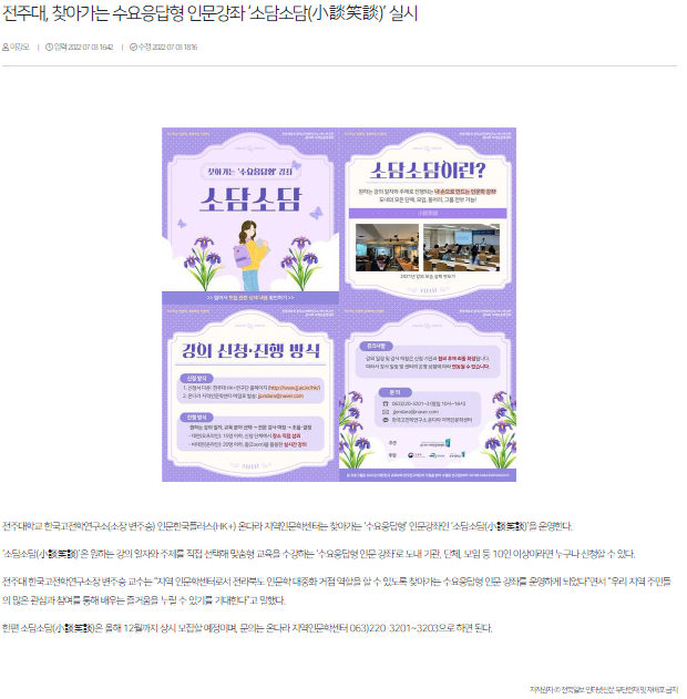 | 550 | 기타 | 전주대, '찾아가는 수요응답형 인문강좌' ‘소담소담(小談笑談)’ 실시 | 온다라 지역인문학센터 | 22-07-04 | 206 |