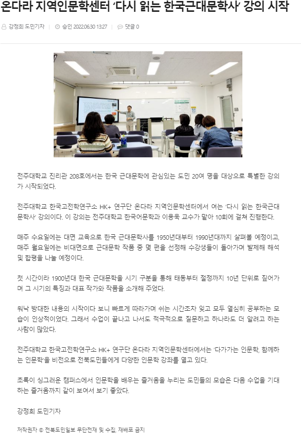 | 556 | 기타 | 온다라 지역인문학센터 ‘다시 읽는 한국근대문학사’ 강의 시작 | 온다라 지역인문학센터 | 22-07-06 | 216 |