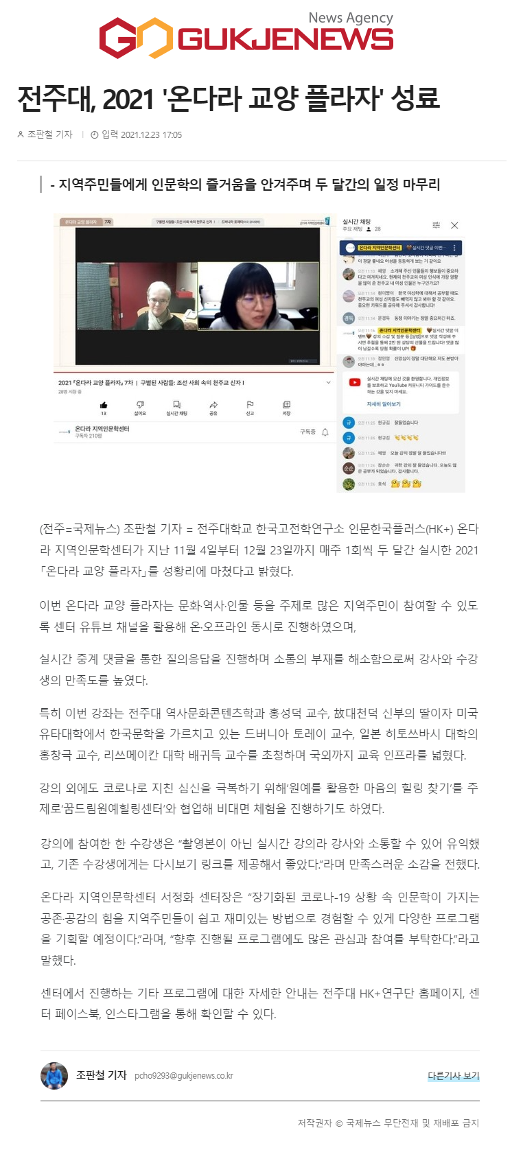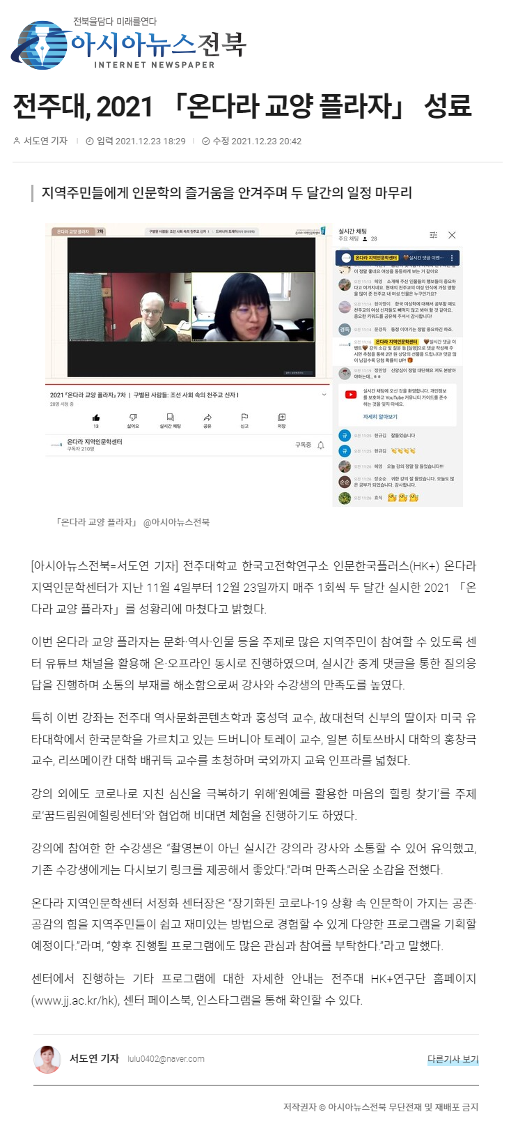 | 503 | 기타 | 전주대, 2021 `온다라 교양 플라자` 성료 | 온다라 지역인문학센터 | 22-02-07 | 171 |