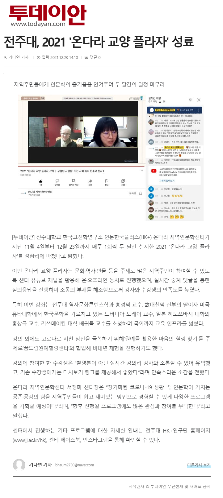 | 508 | 기타 | 전주대, '2021 온다라 교양 플라자' 성료 | 온다라 지역인문학센터 | 22-02-07 | 189 |