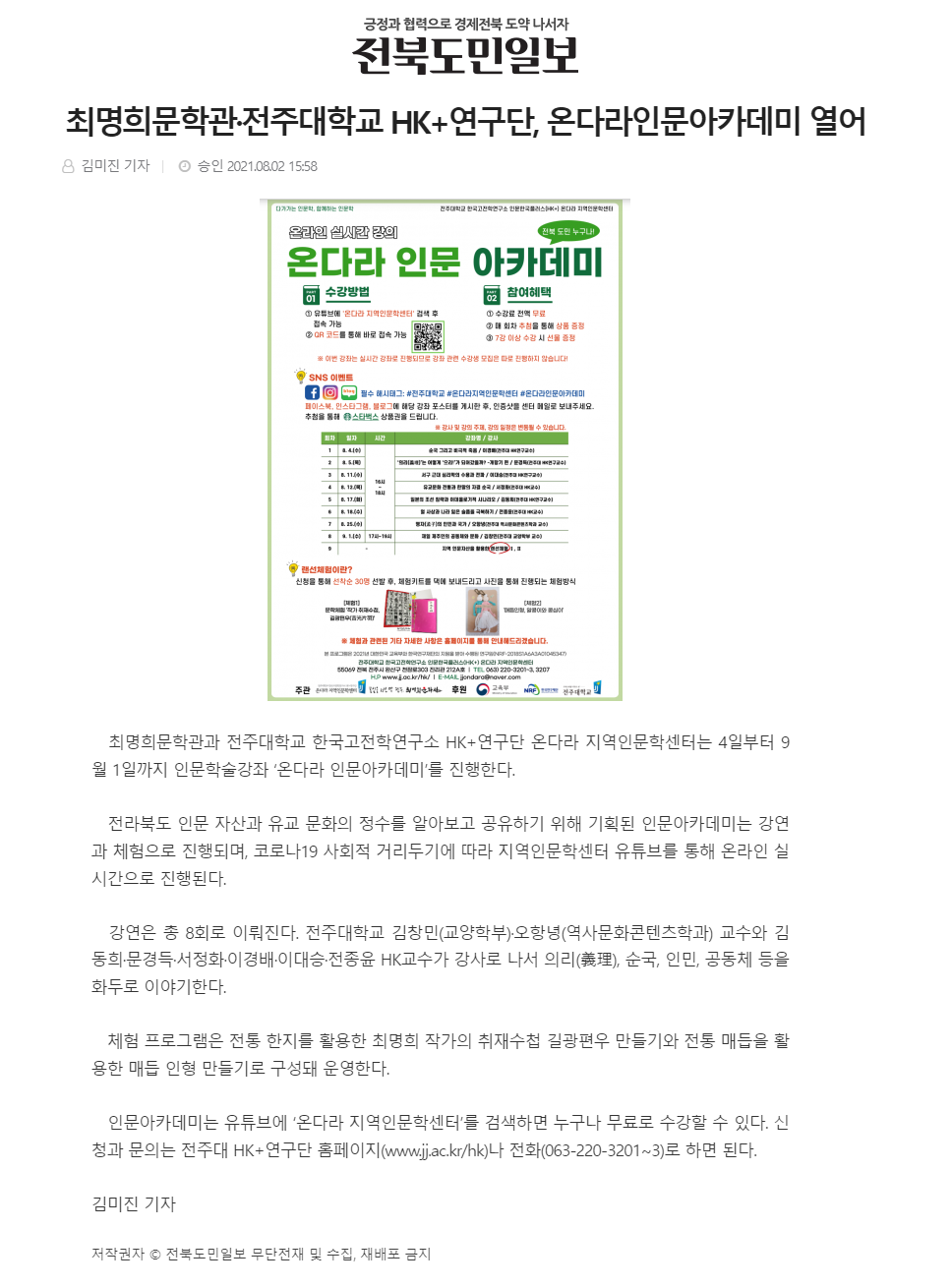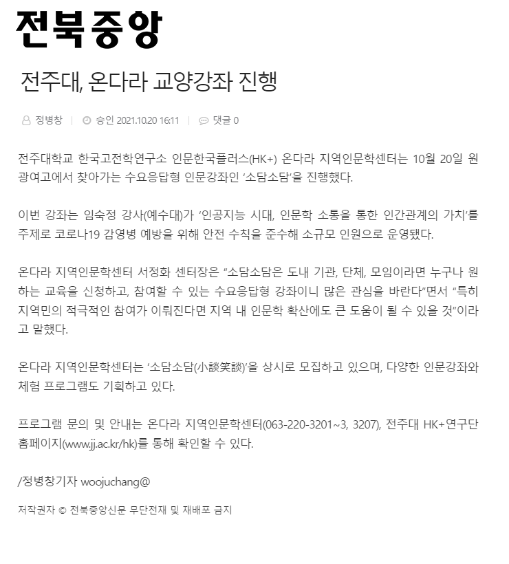 | 479 | 기타 | 최명희문학관·전주대학교 HK+연구단, 온다라인문아카데미 열어 | 온다라 지역인문학센터 | 21-12-02 | 195 |