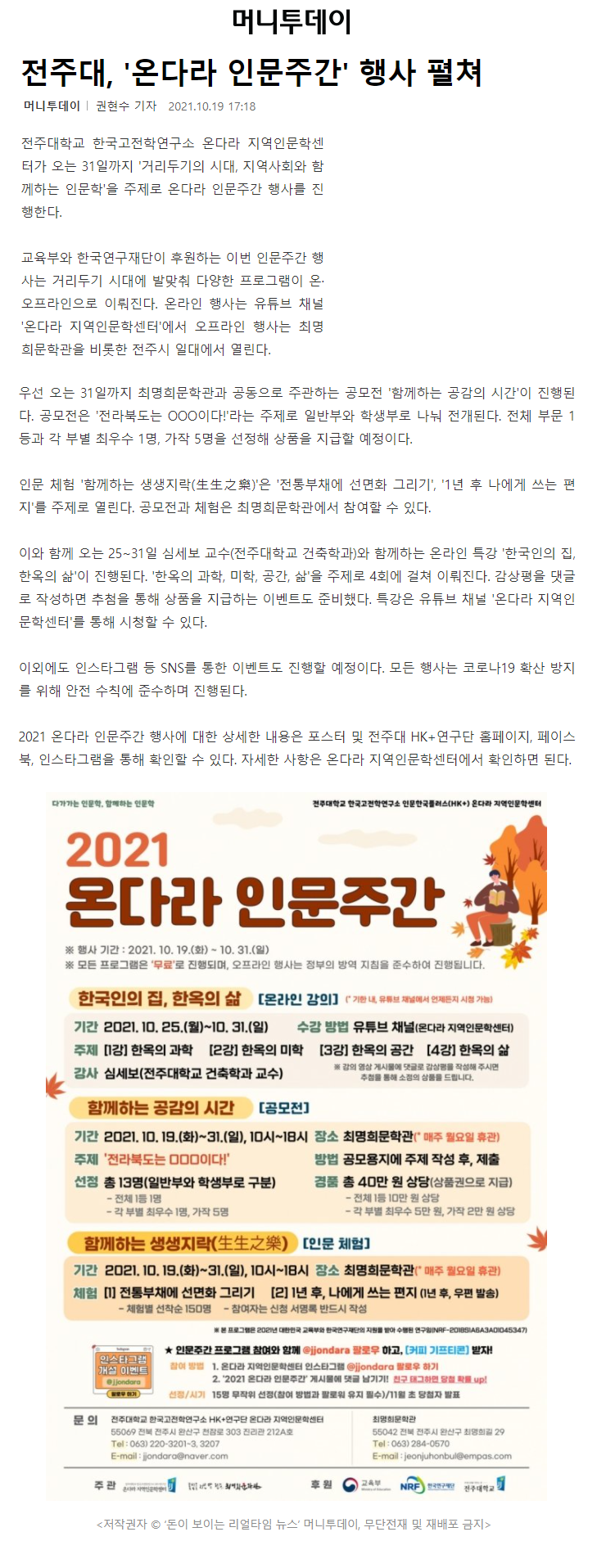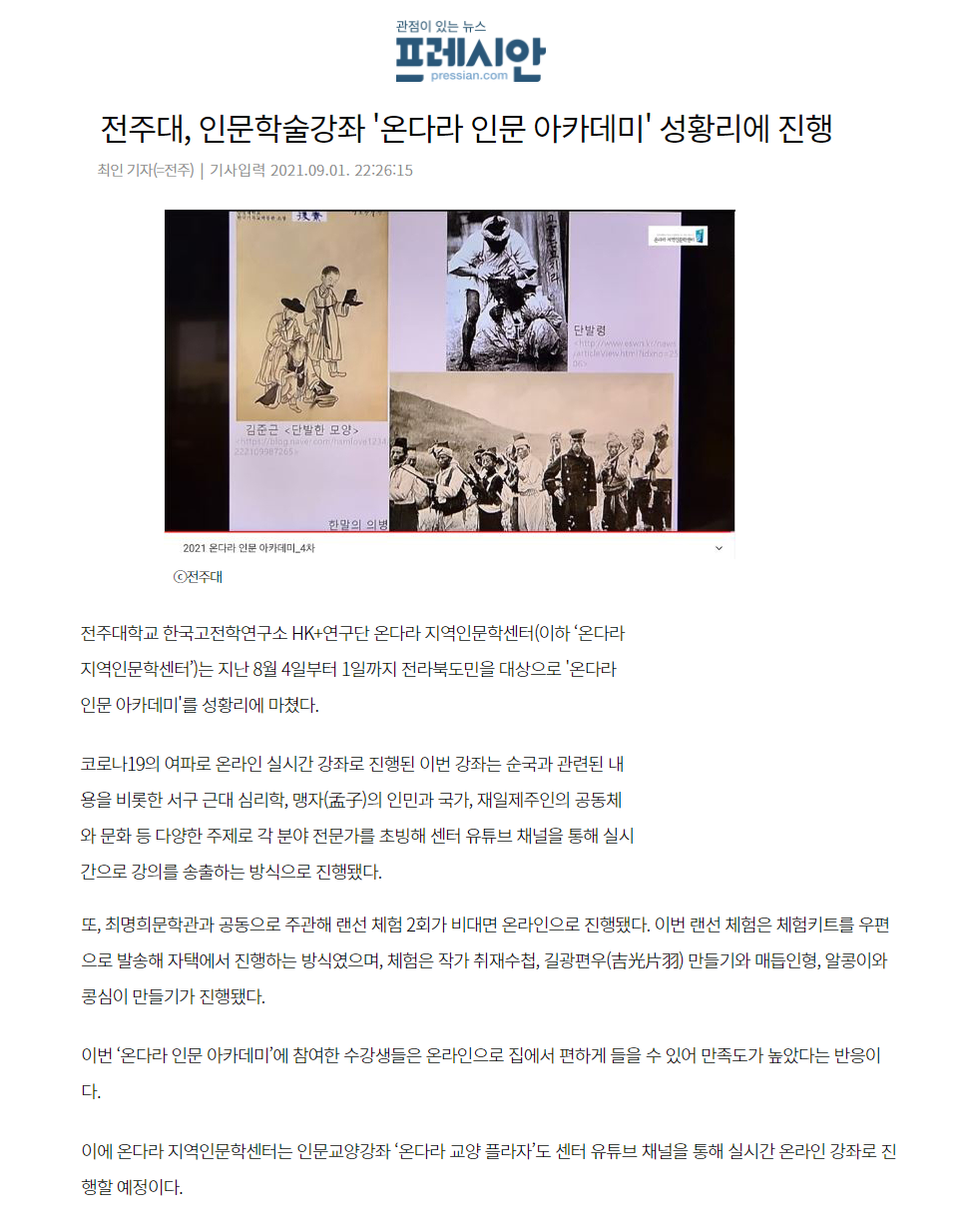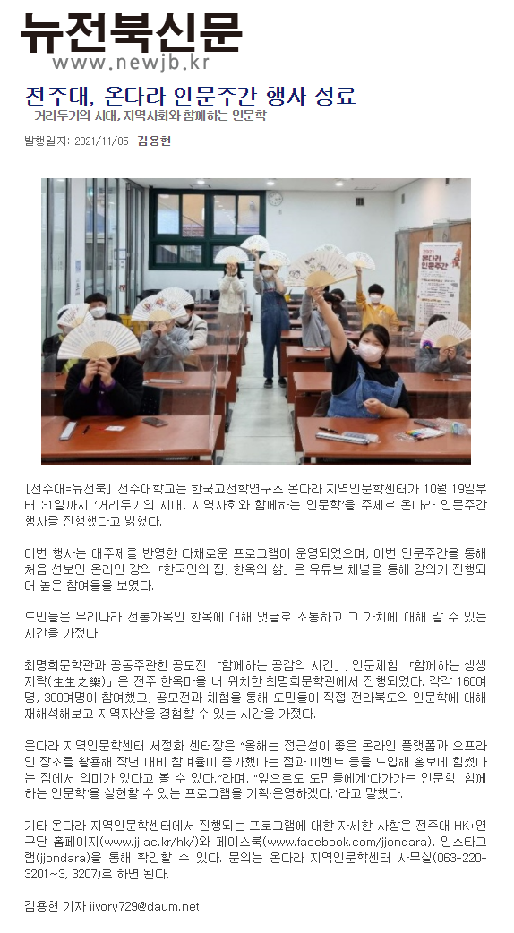 | 480 | 기타 | 전주대, 인문학술강좌 '온다라 인문 아카데미' 성황리에 진행 | 온다라 지역인문학센터 | 21-12-02 | 211 |