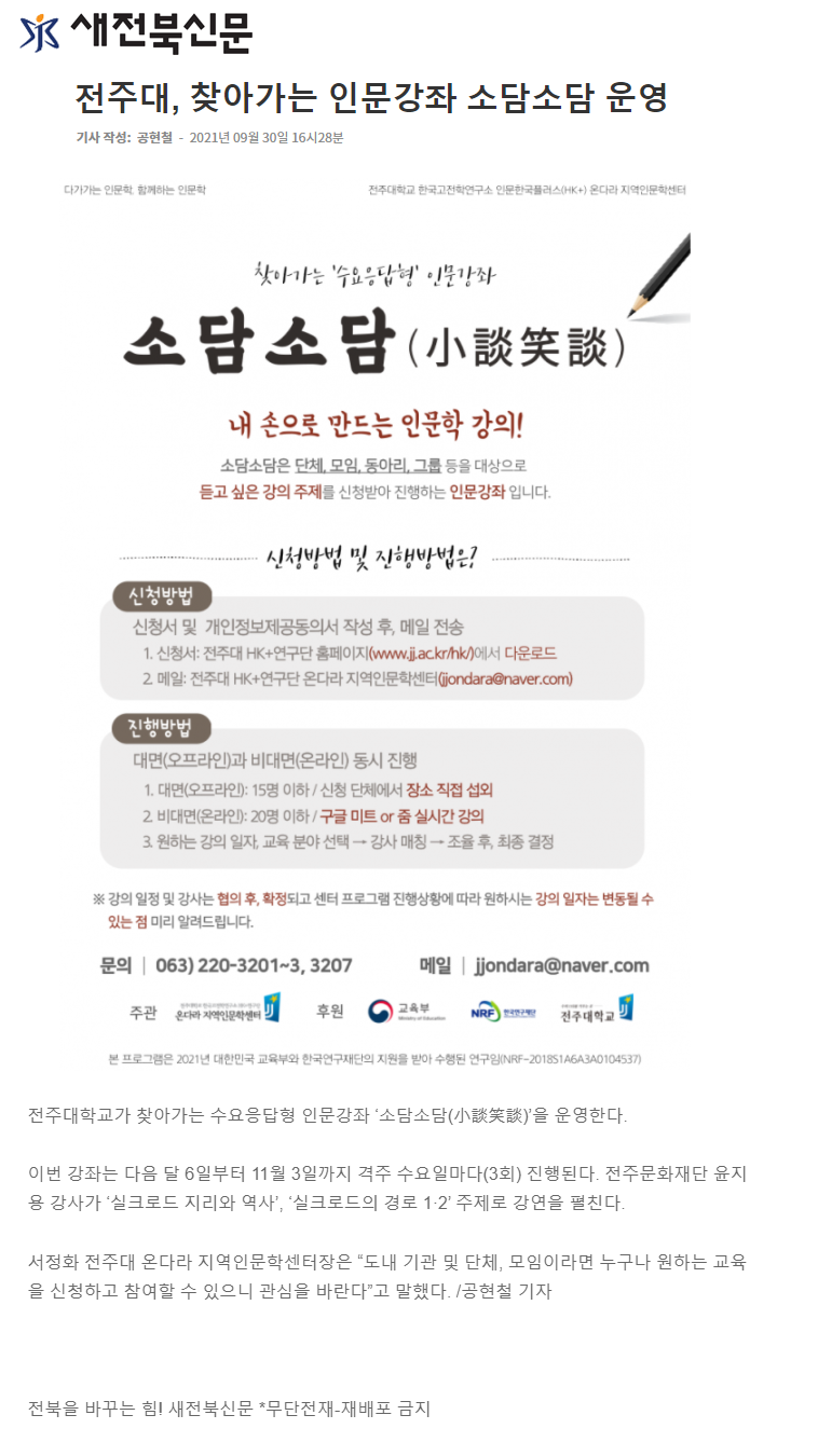 | 482 | 기타 | 전주대, 찾아가는 인문강좌 소담소담 운영 | 온다라 지역인문학센터 | 21-12-02 | 211 |