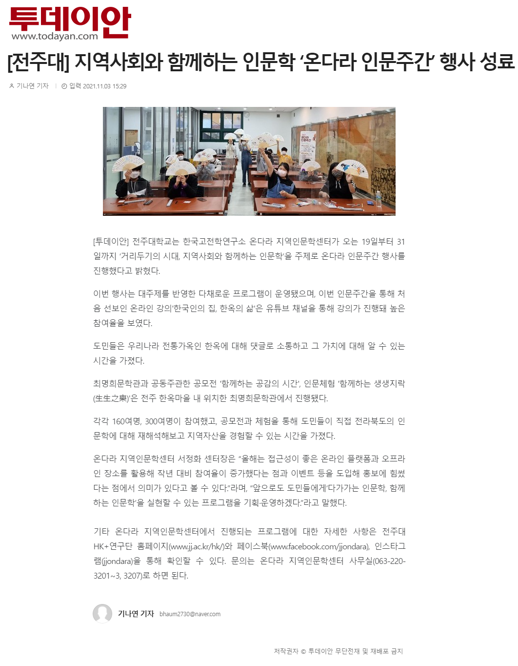 472 기타 [전주대] 지역사회와 함께하는 인문학 '온다라 인문주간' 행사 성료 온다라 지역인문학센터 21-11-09 218   211103_[전주대] 지역사회와 함께하는 인문학 '온다라 인문주간' 행사 성료_투데이안.png