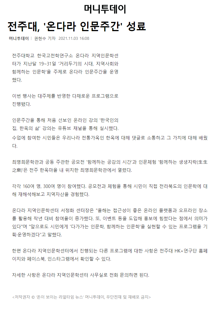 473 기타 전주대 '온다라 인문주간' 성료 온다라 지역인문학센터 21-11-09 220   211103_전주대 '온다라 인문주간' 성료_머니투데이.png