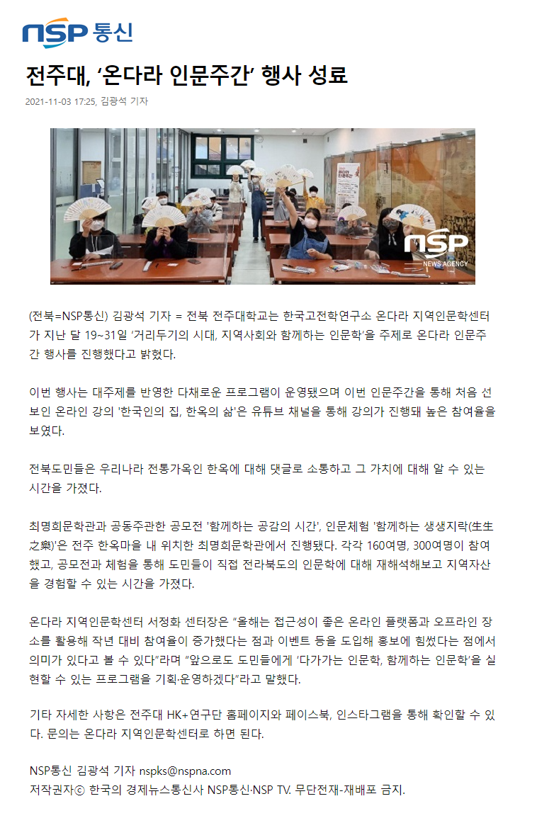 474 기타 전주대, ‘온다라 인문주간’ 행사 성료 온다라 지역인문학센터 21-11-09 211   211103_전주대, ‘온다라 인문주간’ 행사 성료_nsp통신.png