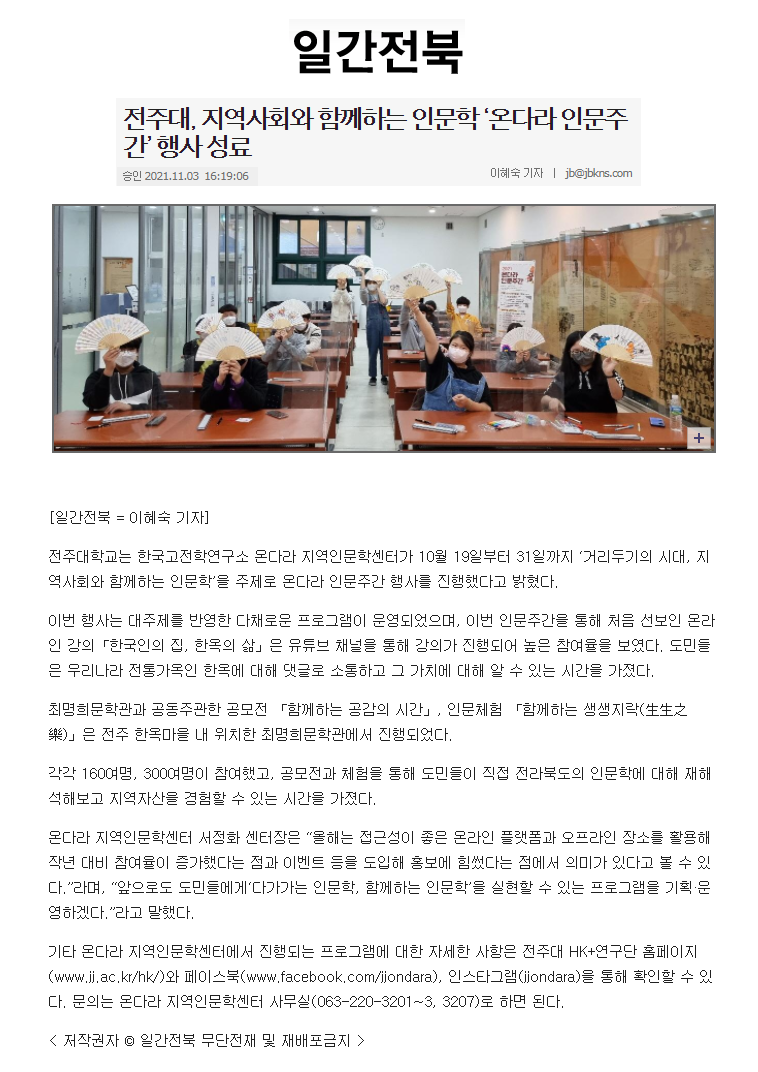 475 기타 전주대, 지역사회와 함께하는 인문학 '온다라 인문주간' 행사 성료 온다라 지역인문학센터 21-11-09 276   211103_전주대, 지역사회와 함께하는 인문학 '온다라 인문주간' 행사 성료_일간전북.png