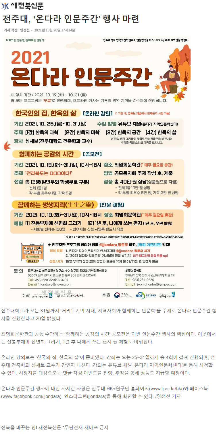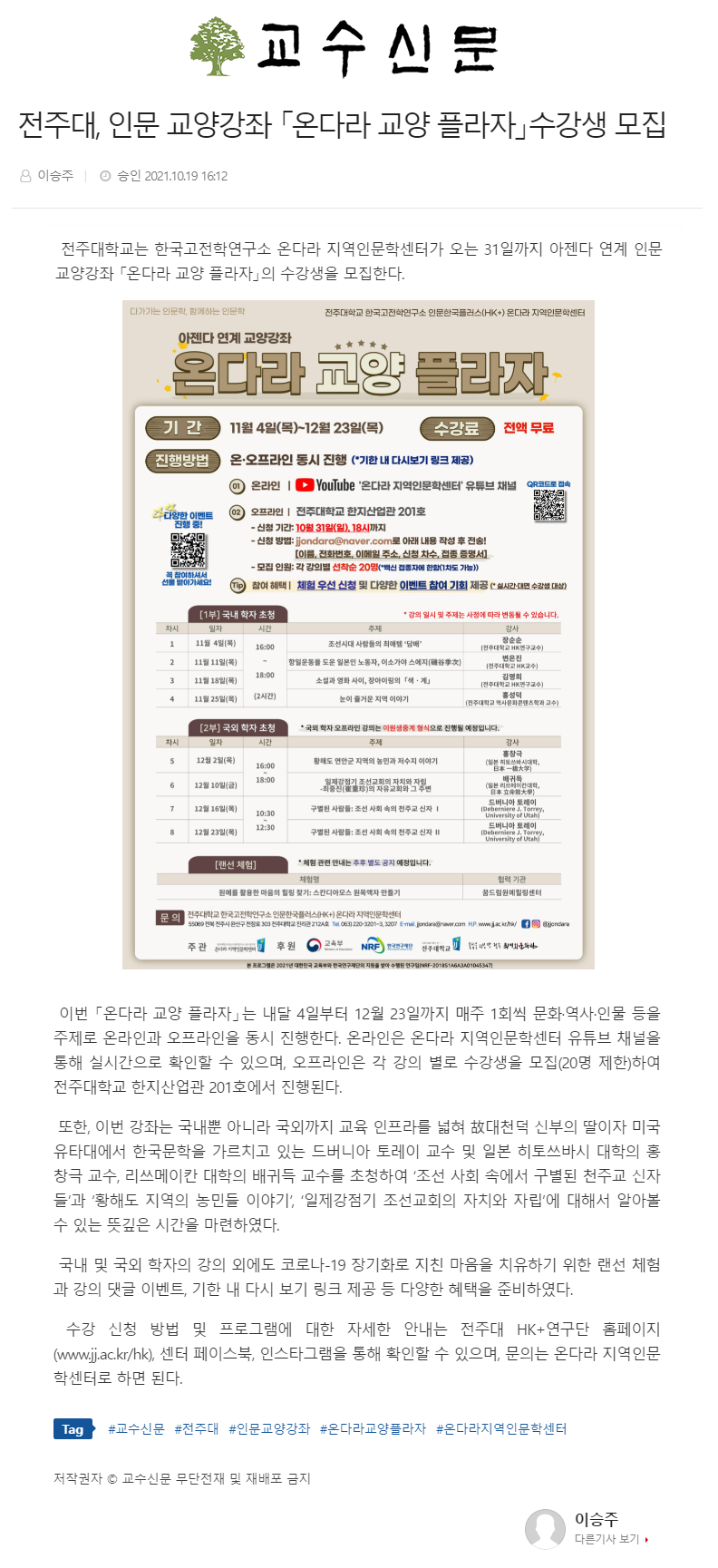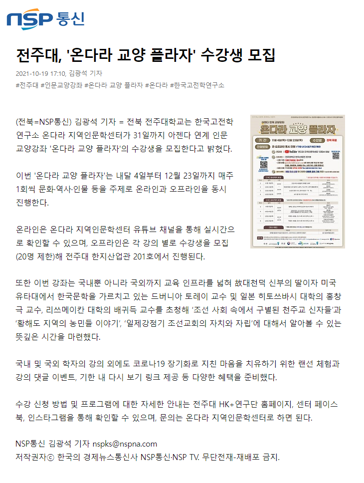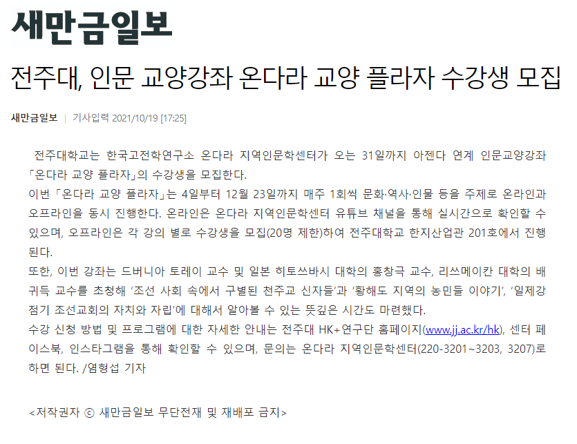 | 462 | 기타 | 전주대, 인문 교양강좌 <온다라 교양 플라자> 수강생 모집 | 온다라 지역인문학센터 | 21-10-20 | 207 |