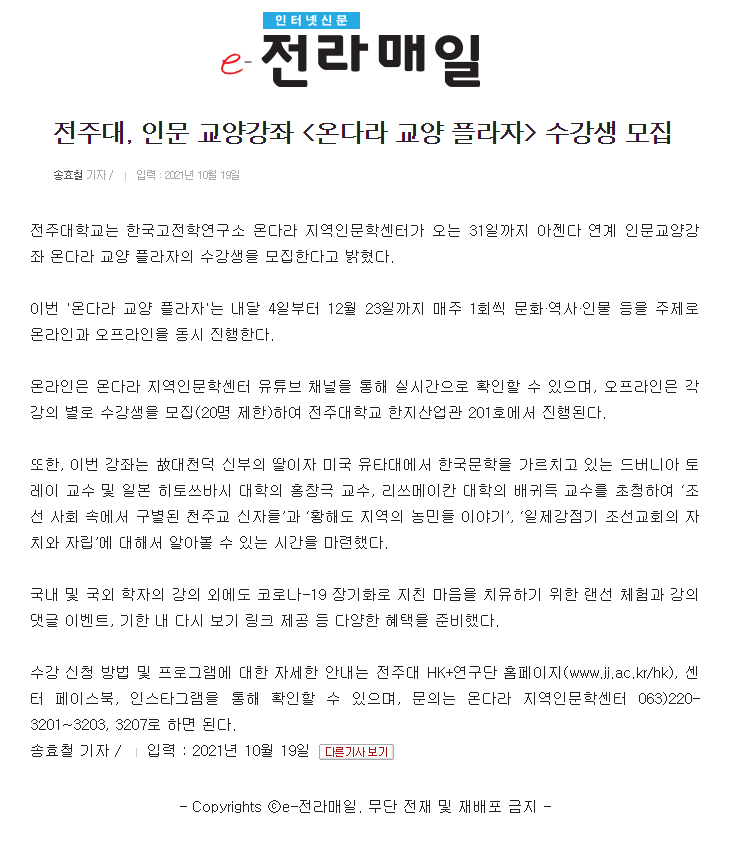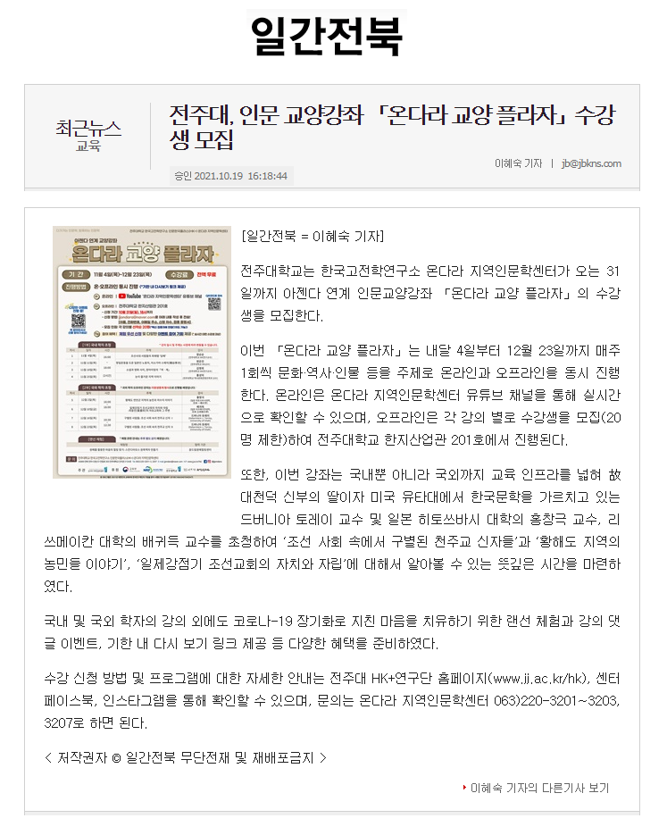 | 463 | 기타 | 전주대, 인문 교양강좌 온다라 교양 플라자 수강생 모집 | 온다라 지역인문학센터 | 21-10-20 | 222 |
