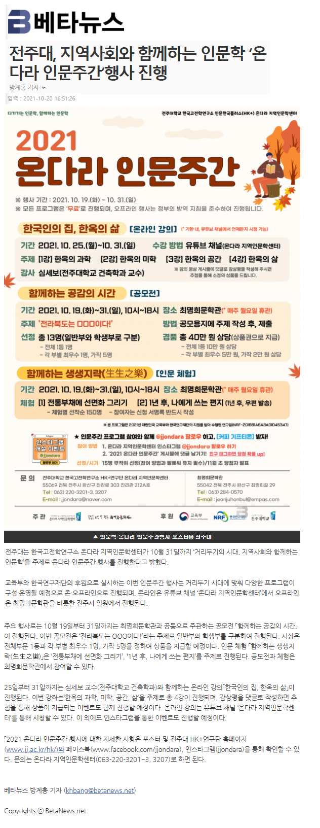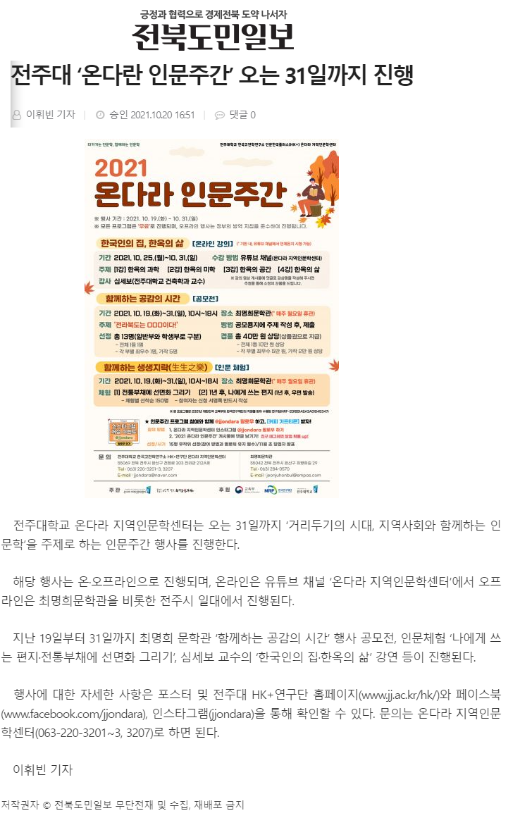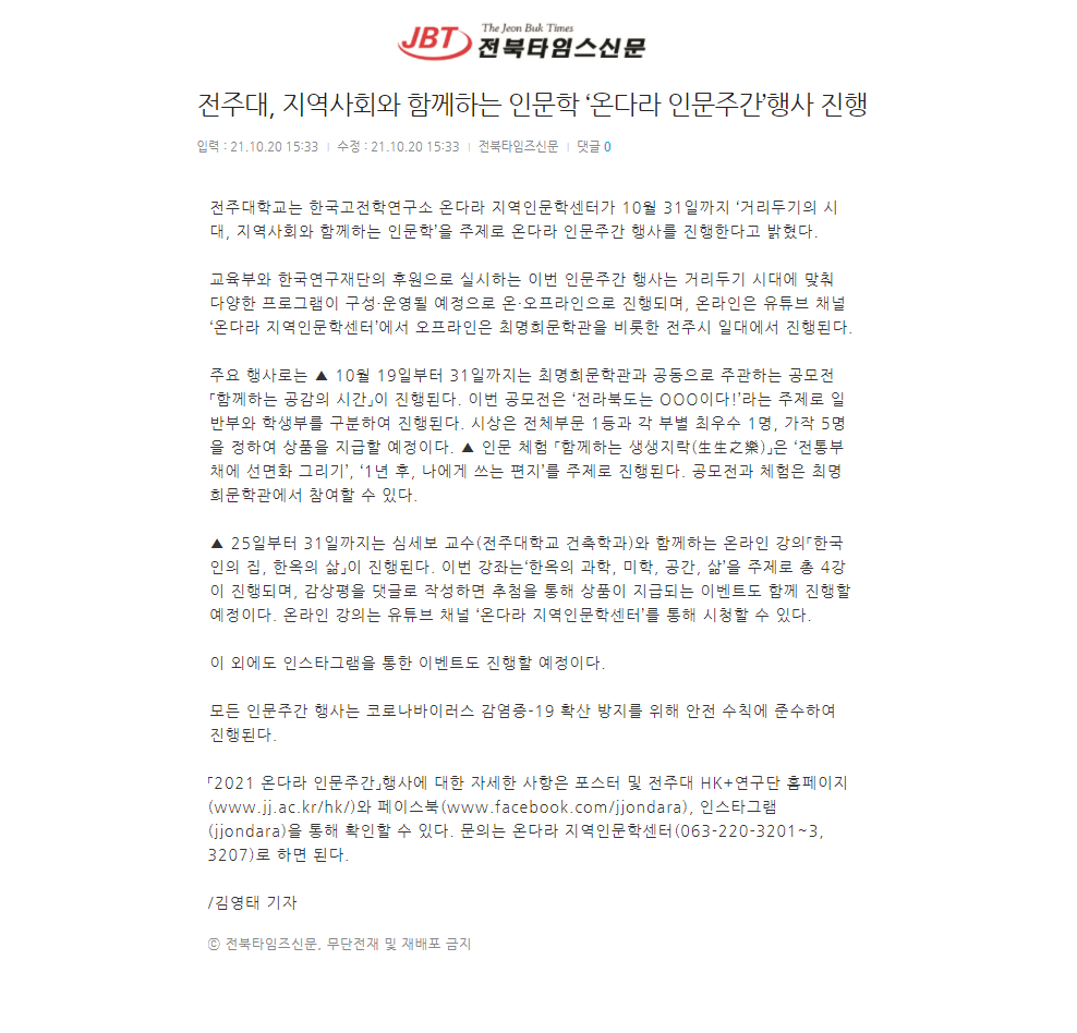 | 464 | 기타 | 전주대 ‘온다라 인문주간’ 오는 31일까지 진행 | 온다라 지역인문학센터 | 21-10-25 | 202 |