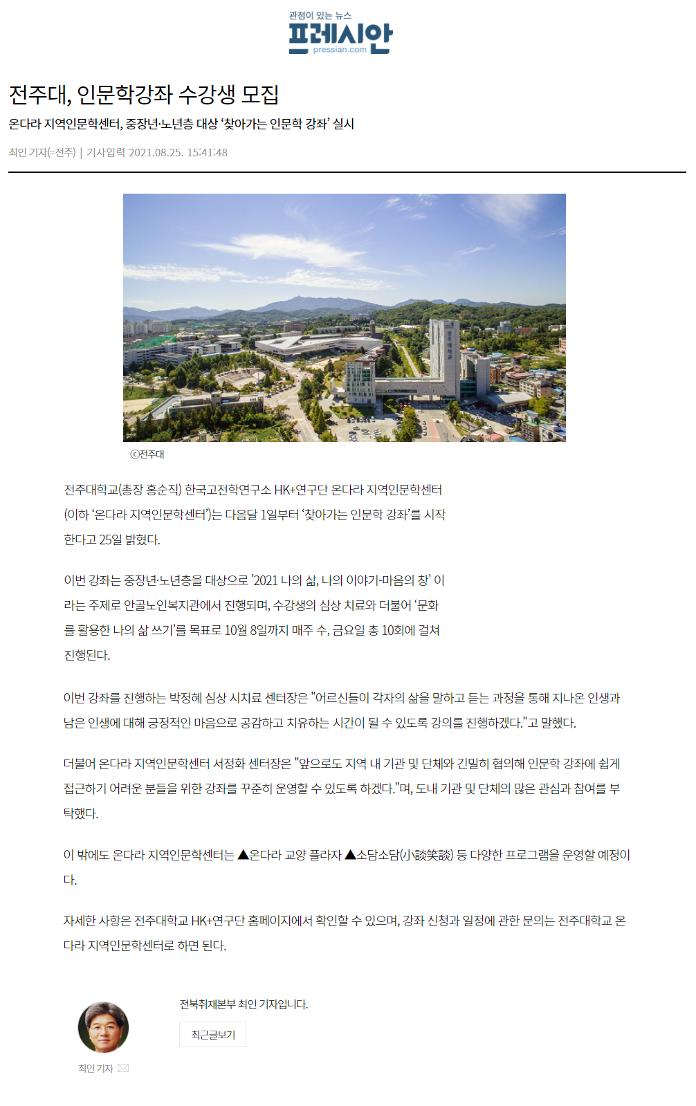 | 414 | 기타 | 전주대, 인문학술강좌 '온다라 인문 아카데미' 실시 | 온다라 지역인문학센터 | 21-09-08 | 192 |