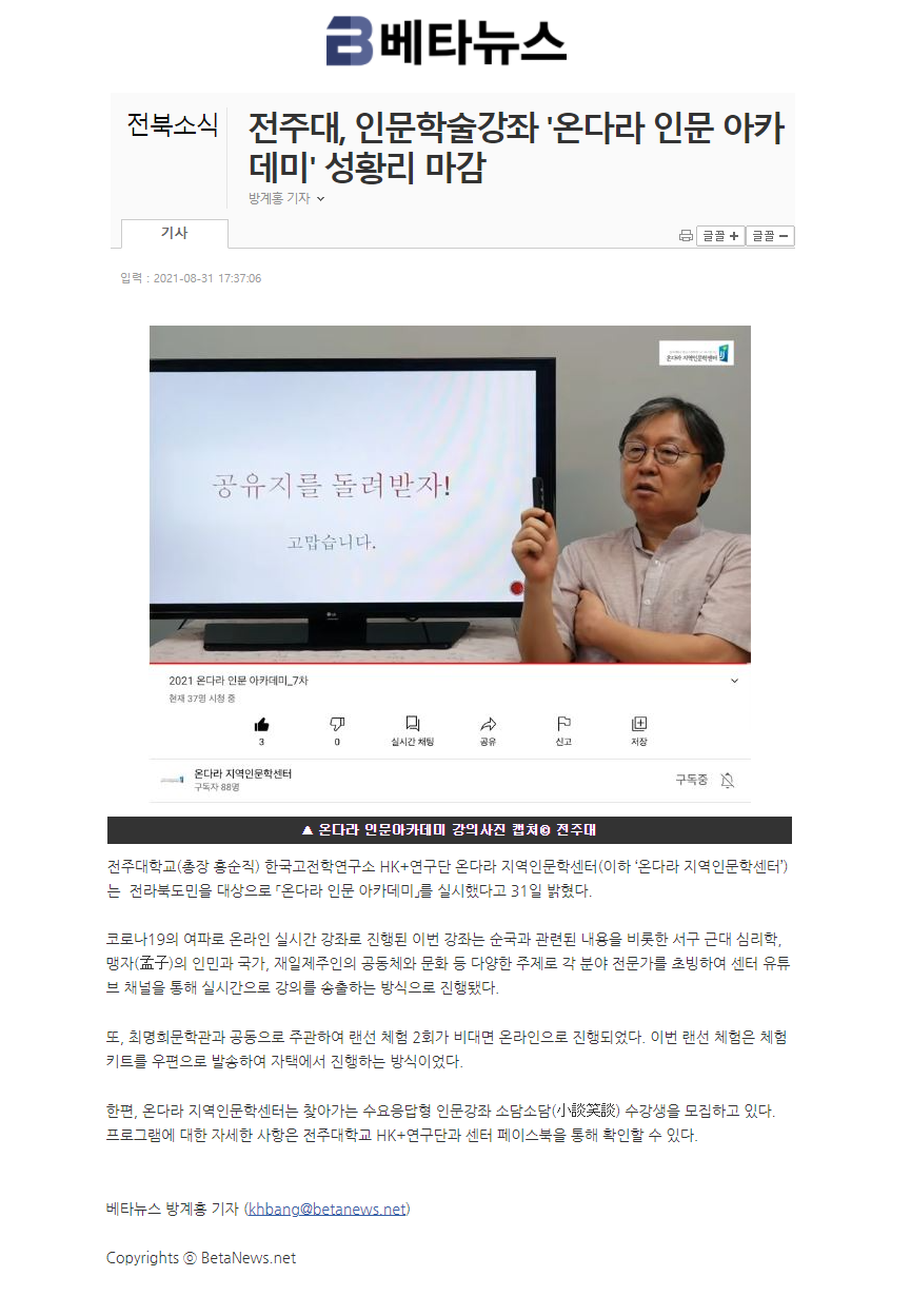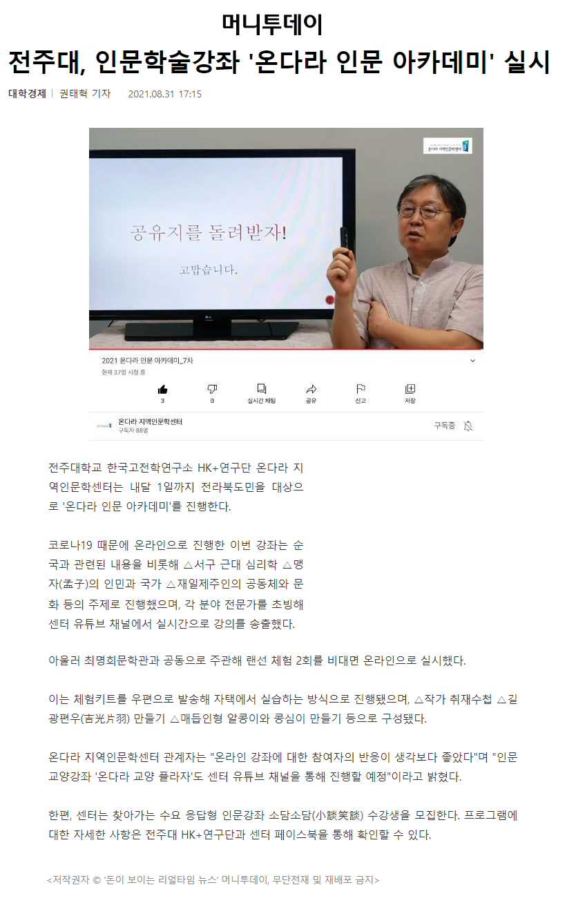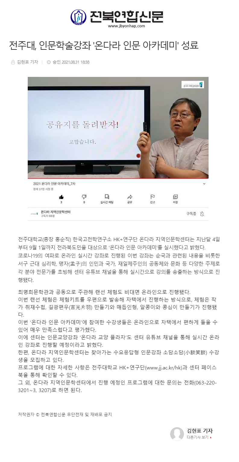 | 411 | 기타 | 전주대, 인문학술강좌 「온다라 인문 아카데미」성황리에 성료 | 온다라 지역인문학센터 | 21-09-08 | 190 |