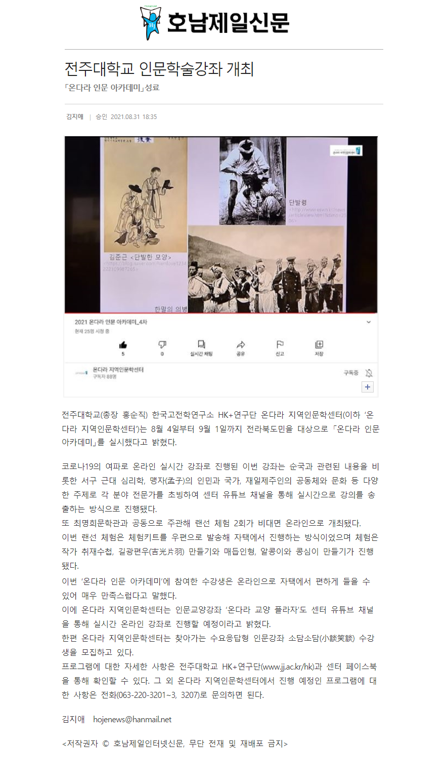 | 412 | 기타 | 전주대, 인문학술강좌 '온다라 인문 아카데미' 성료 | 온다라 지역인문학센터 | 21-09-08 | 198 |