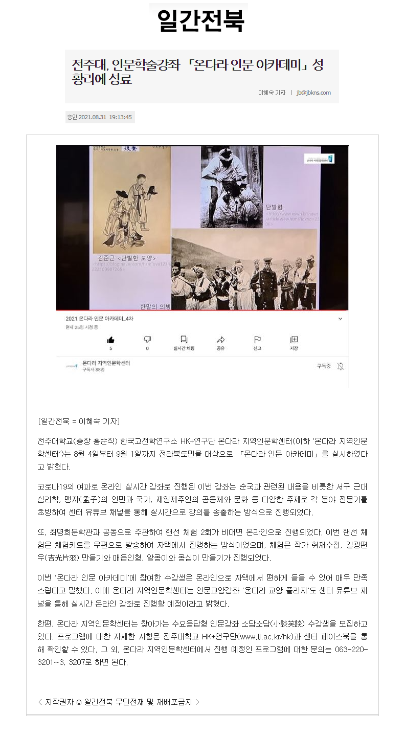 | 413 | 기타 | 전주대, 인문학술강좌 '온다라 인문 아카데미' 성황리 마감 | 온다라 지역인문학센터 | 21-09-08 | 199 |