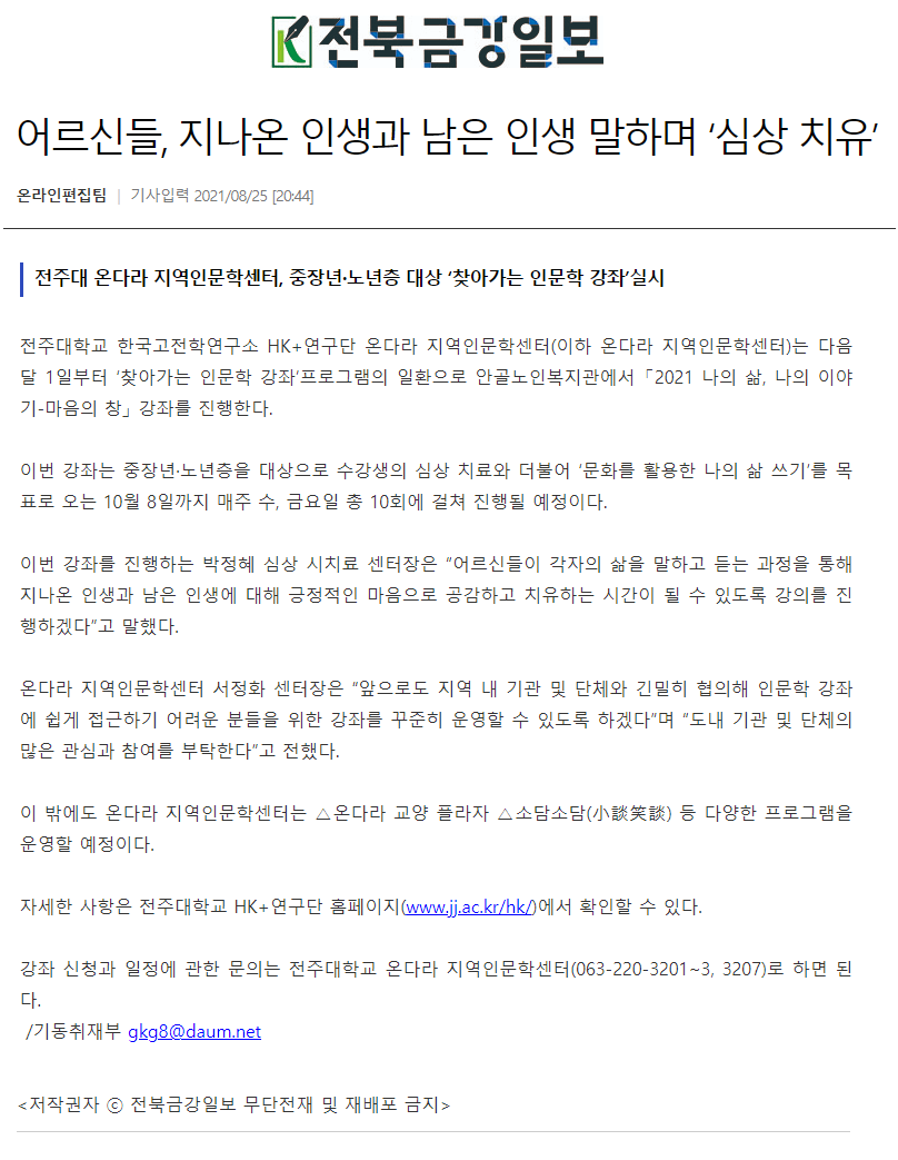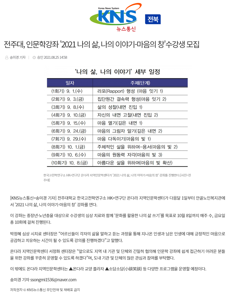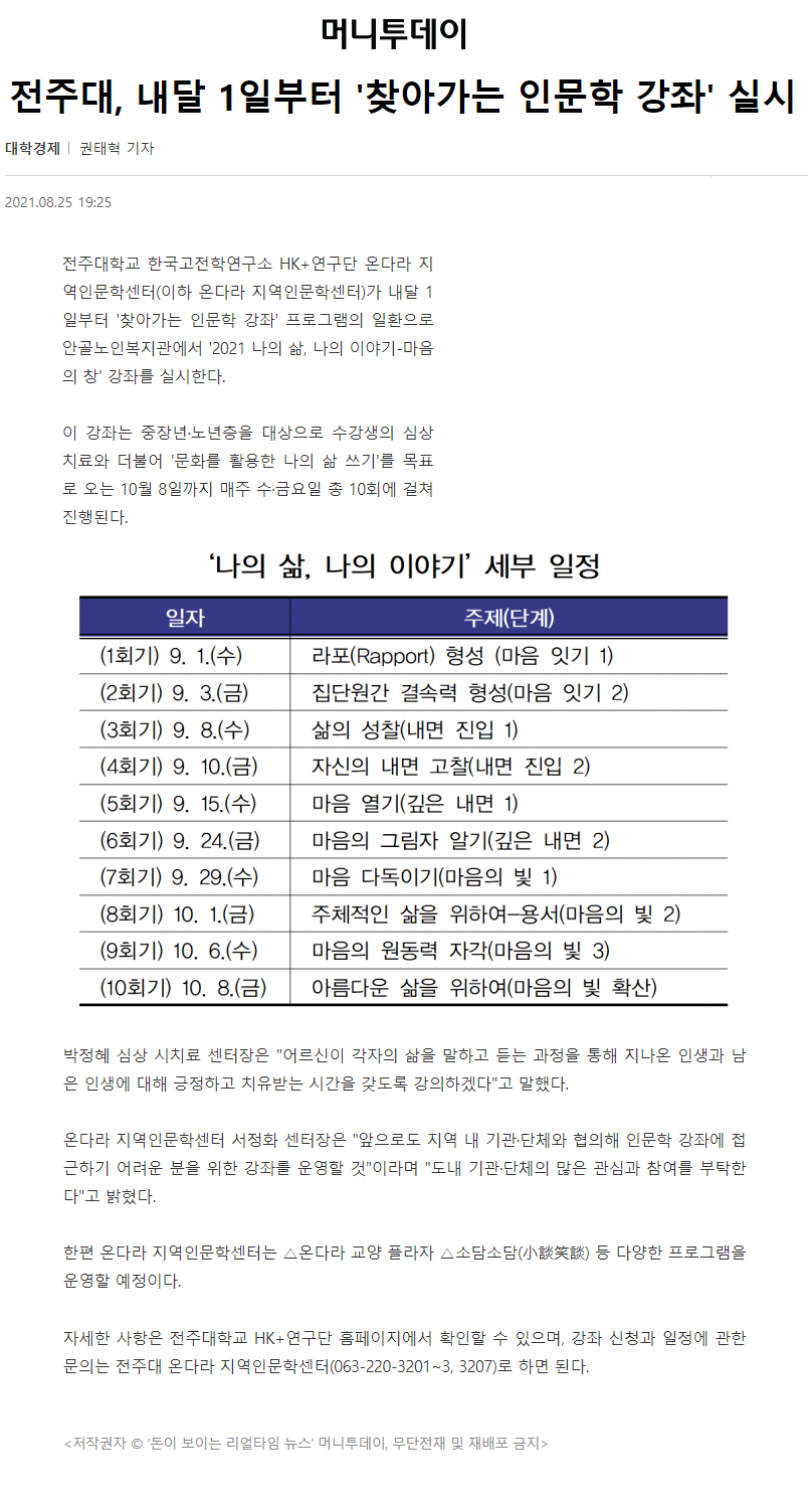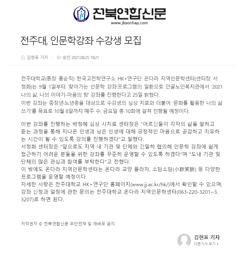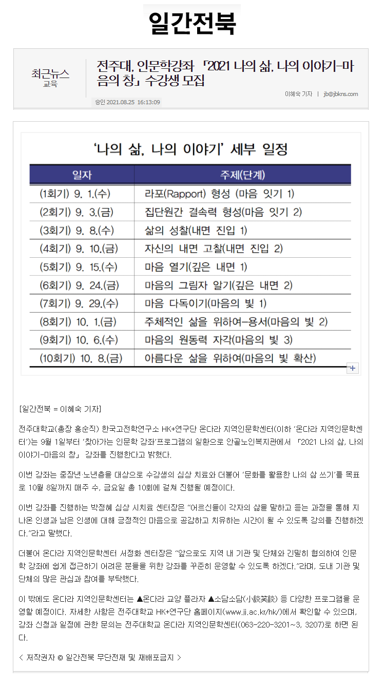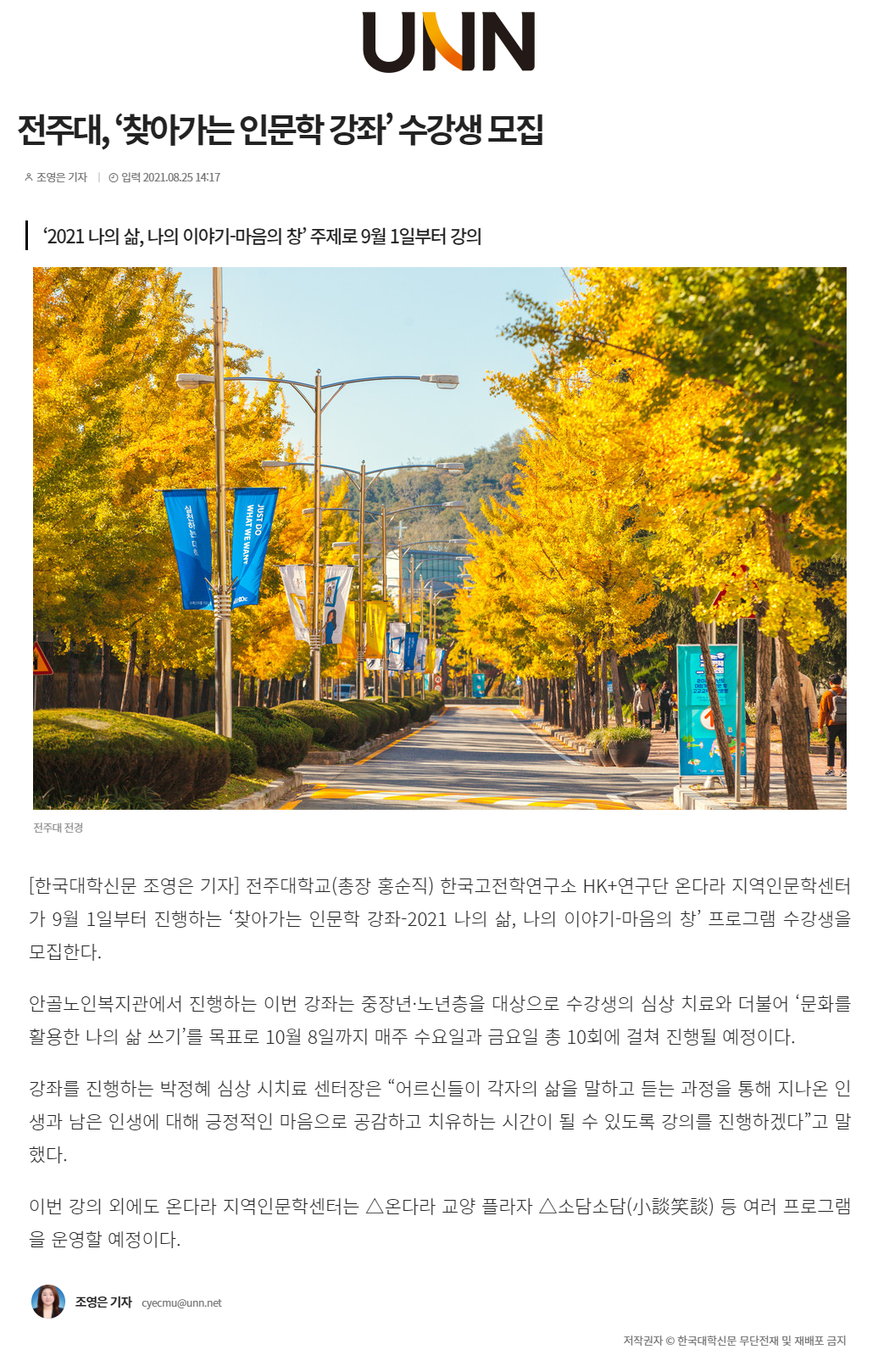 | 404 | 기타 | 전주대, 인문학강좌 「2021 나의 삶, 나의 이야기-마음의 창」수강생 모집 | 온다라 지역인문학센터 | 21-09-08 | 183 |