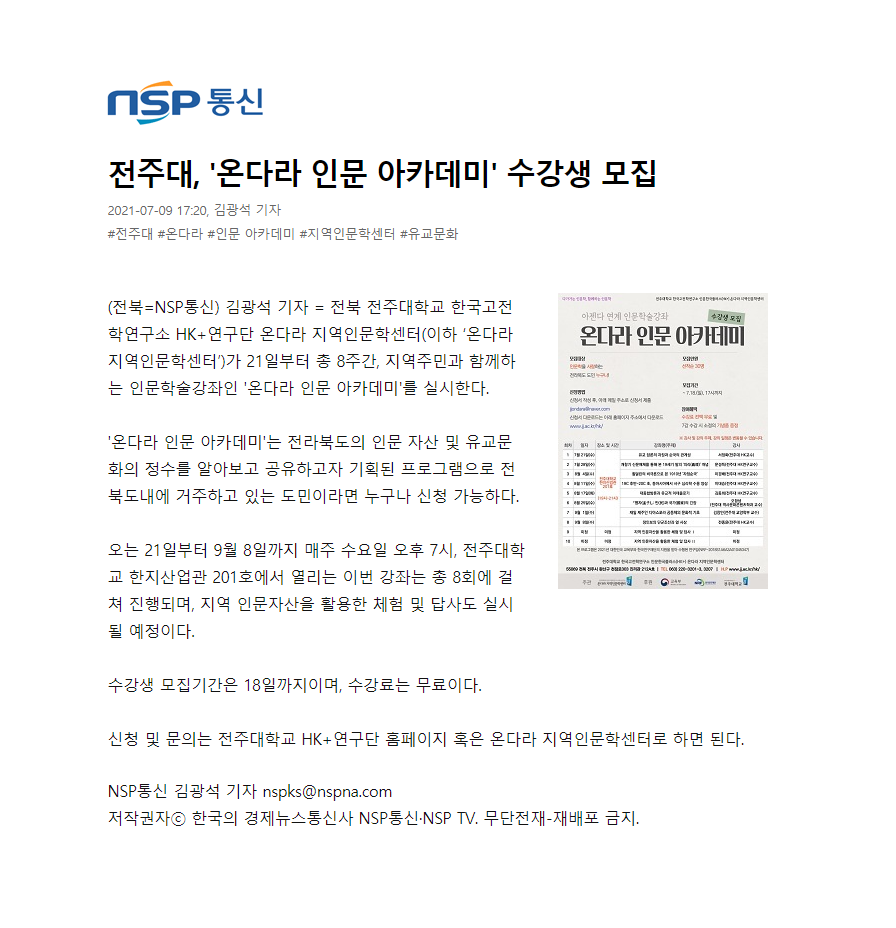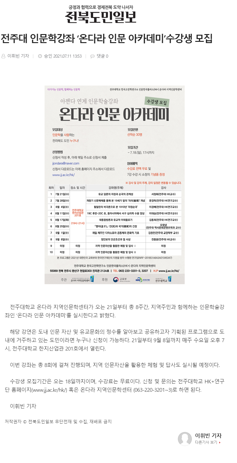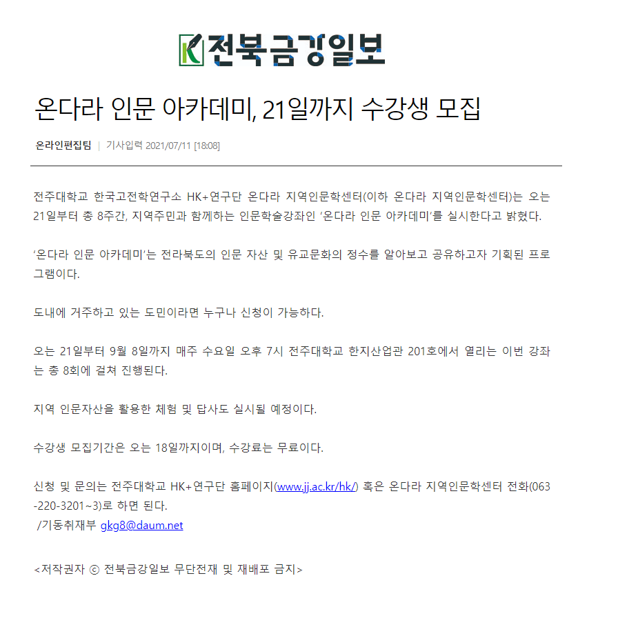 386 기타 전주대, 인문학강좌 온다라 인문 아카데미 수강생 모집 온다라 지역인문학센터 21-07-14 215   210711_전주대, 인문학강좌 온다라 인문 아카데미 수강생 모집_e-전라매일.png