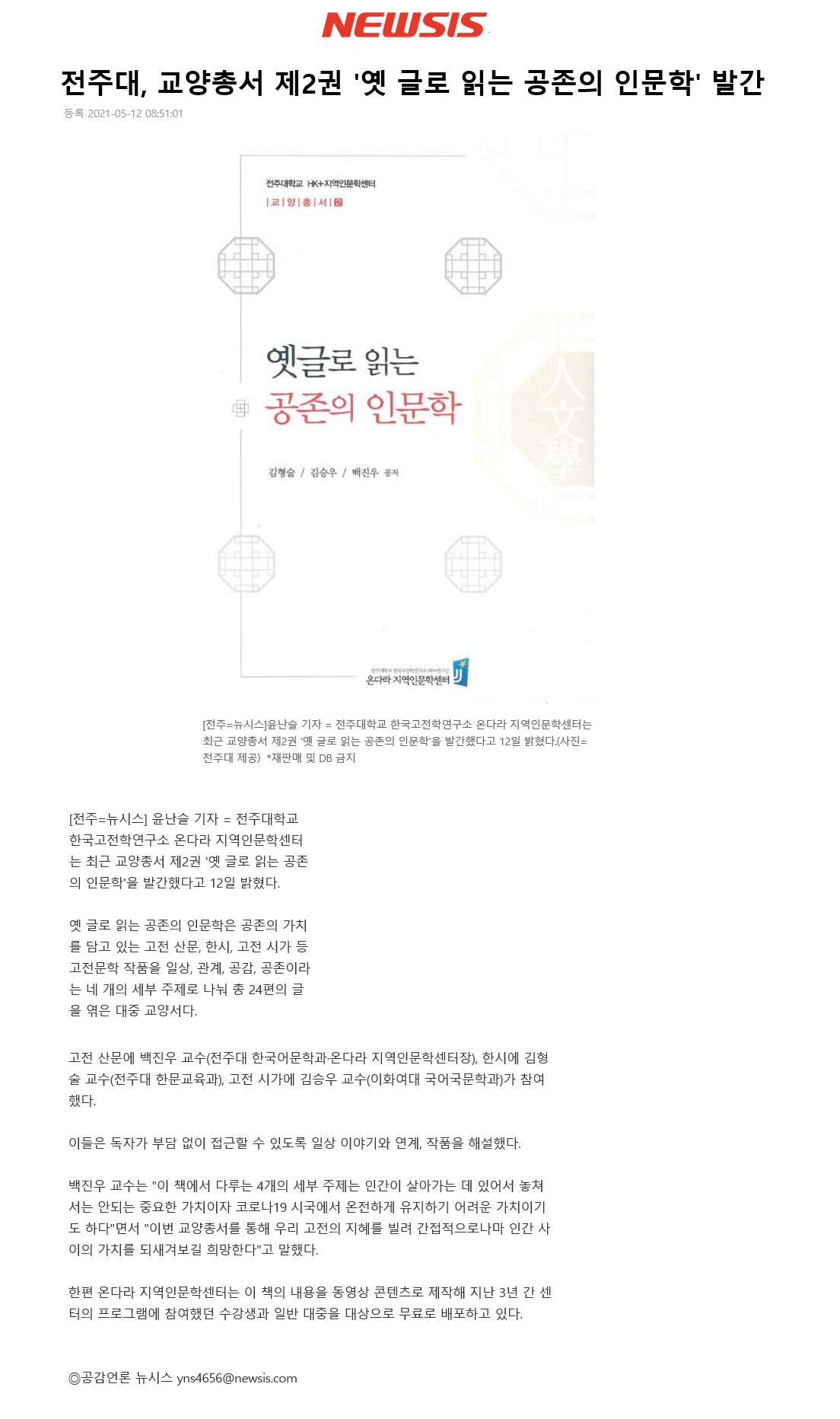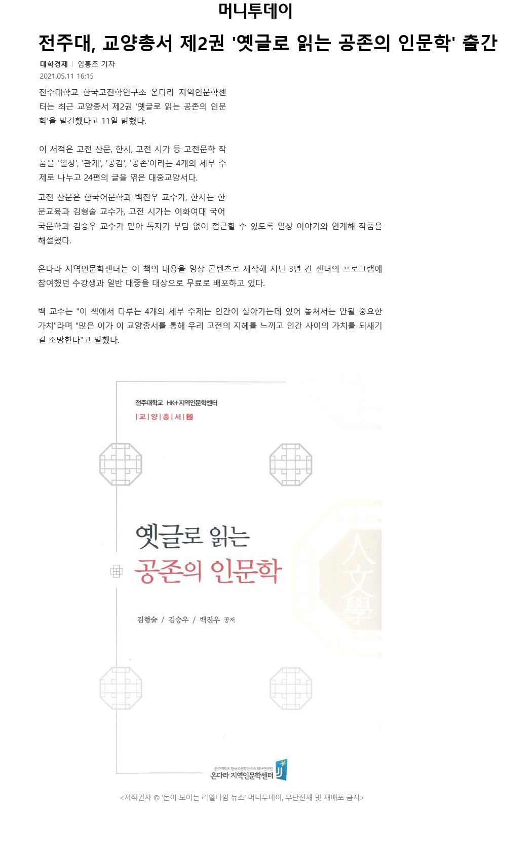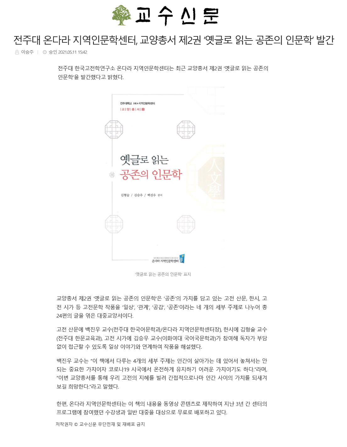| 370 | 기타 | 전주대 온다라 지역인문학센터, 교양총서 제2권 ‘옛글로 읽는 공존의 인문학’ 발간 | 온다라 지역인문학센터 | 21-05-18 | 220 |