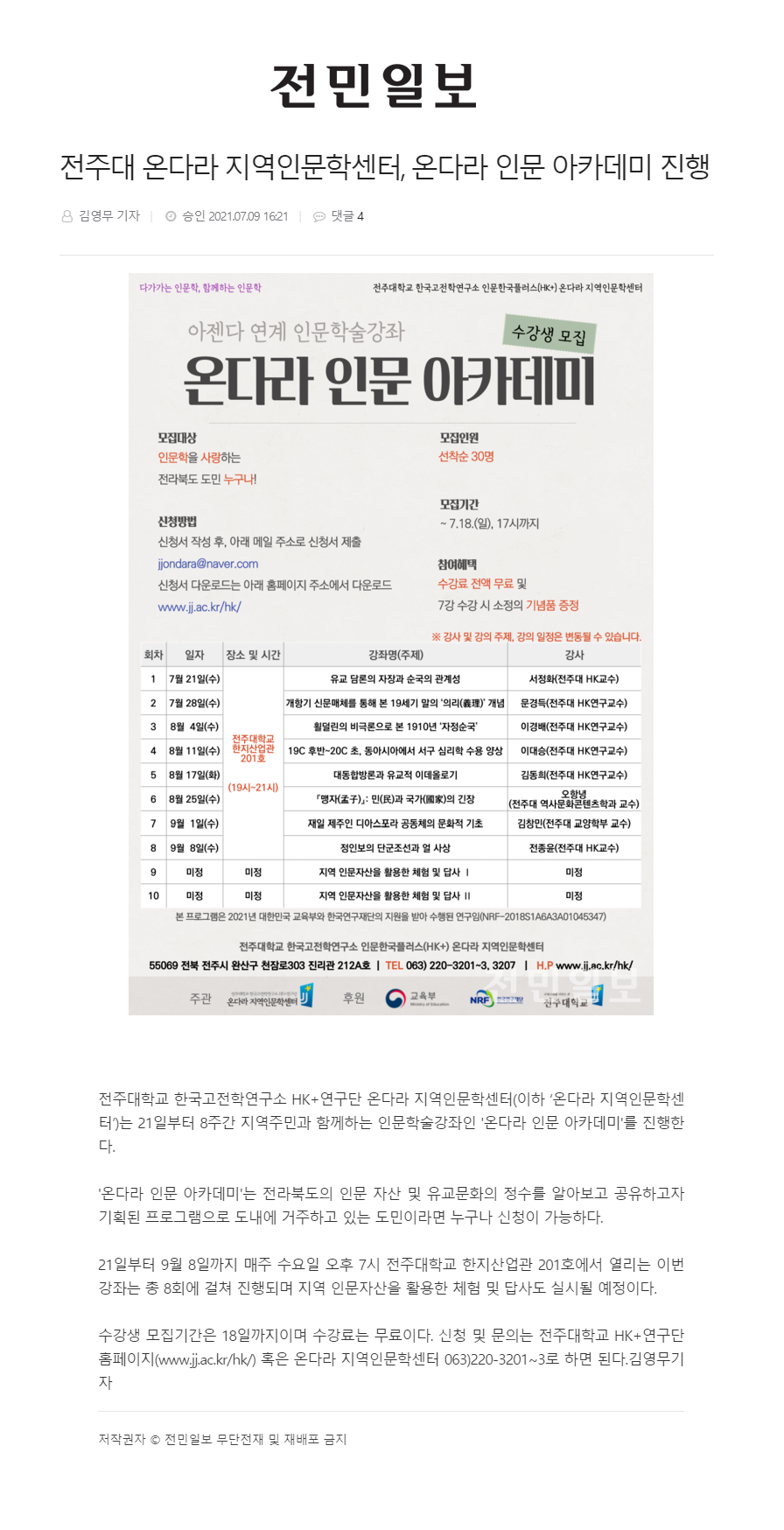 | 378 | 기타 | 전주대 온다라 지역인문학센터, 온다라 인문 아카데미 진행 | 온다라 지역인문학센터 | 21-07-14 | 192 |