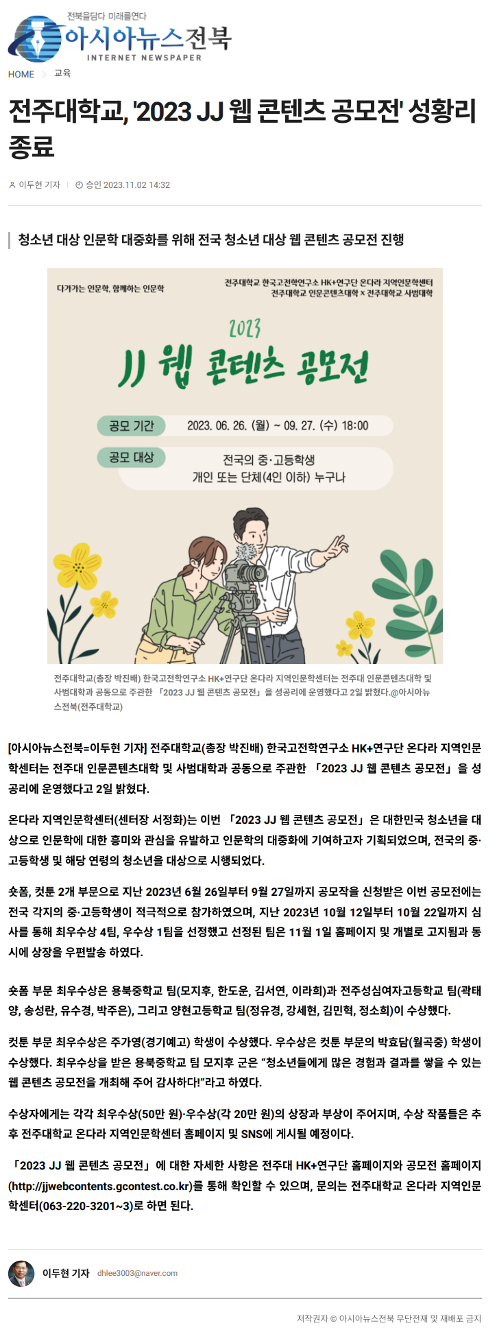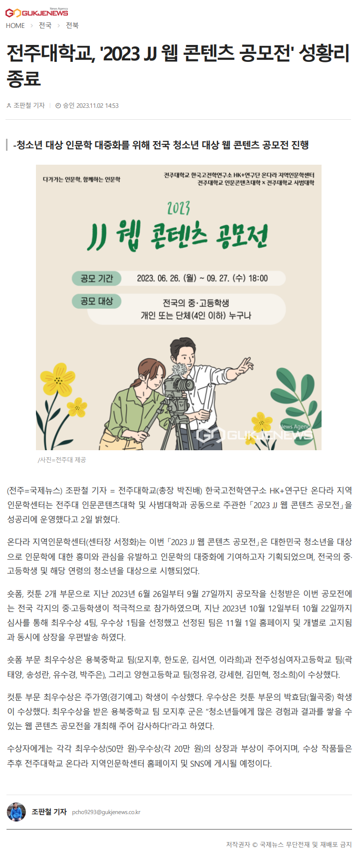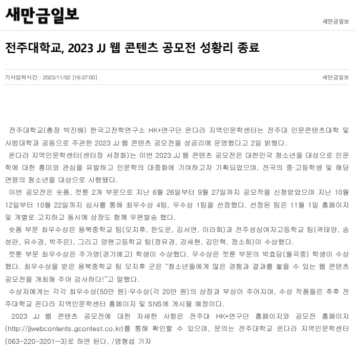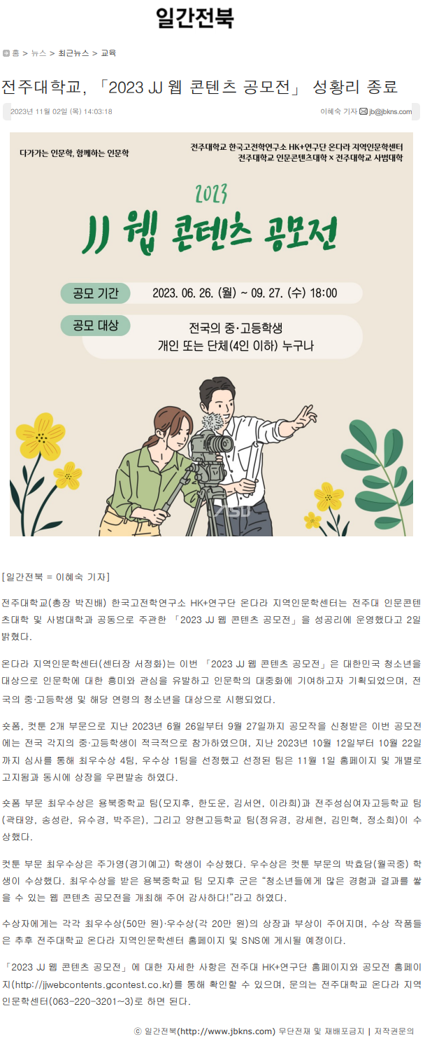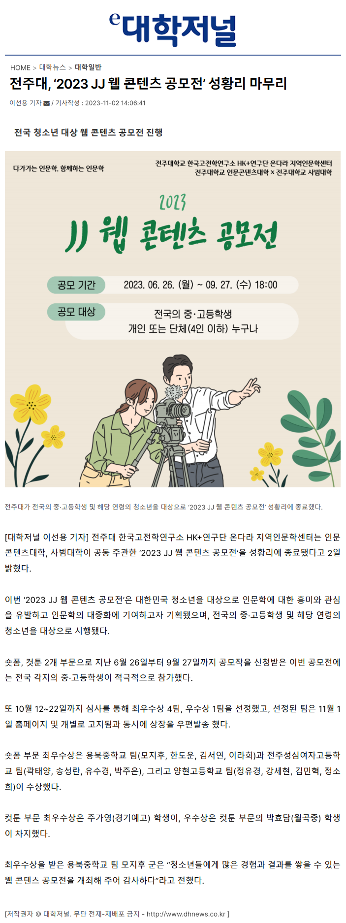 | 709 | 기타 | 전주대, ‘2023 JJ 웹 콘텐츠 공모전’ 성황리 마무리 | 온다라 지역인문학센터 | 23-11-14 | 178 |