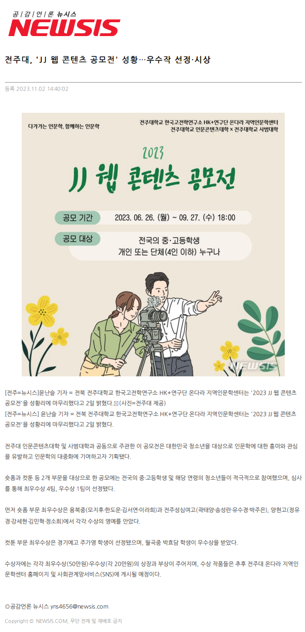| 711 | 기타 | 전주대, 'JJ 웹 콘텐츠 공모전' 성황…우수작 선정·시상 | 온다라 지역인문학센터 | 23-11-14 | 170 |