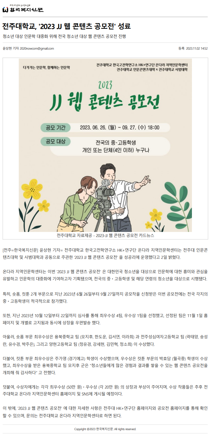 | 714 | 기타 | 전주대학교, '2023 JJ 웹 콘텐츠 공모전' 성료 | 온다라 지역인문학센터 | 23-11-14 | 191 |