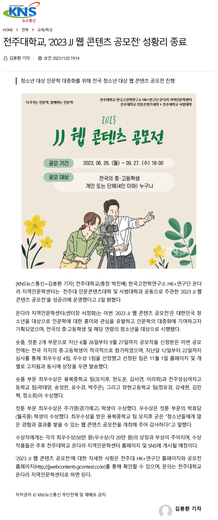 | 710 | 기타 | 전주대, '2023 JJ 웹 콘텐츠 공모전' 성황리 종료 | 온다라 지역인문학센터 | 23-11-14 | 169 |