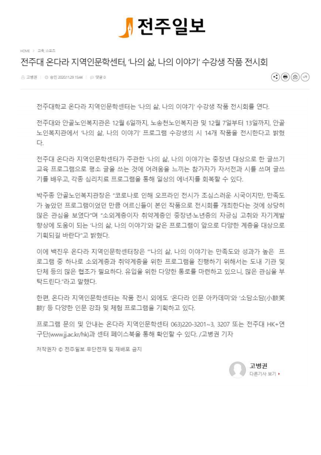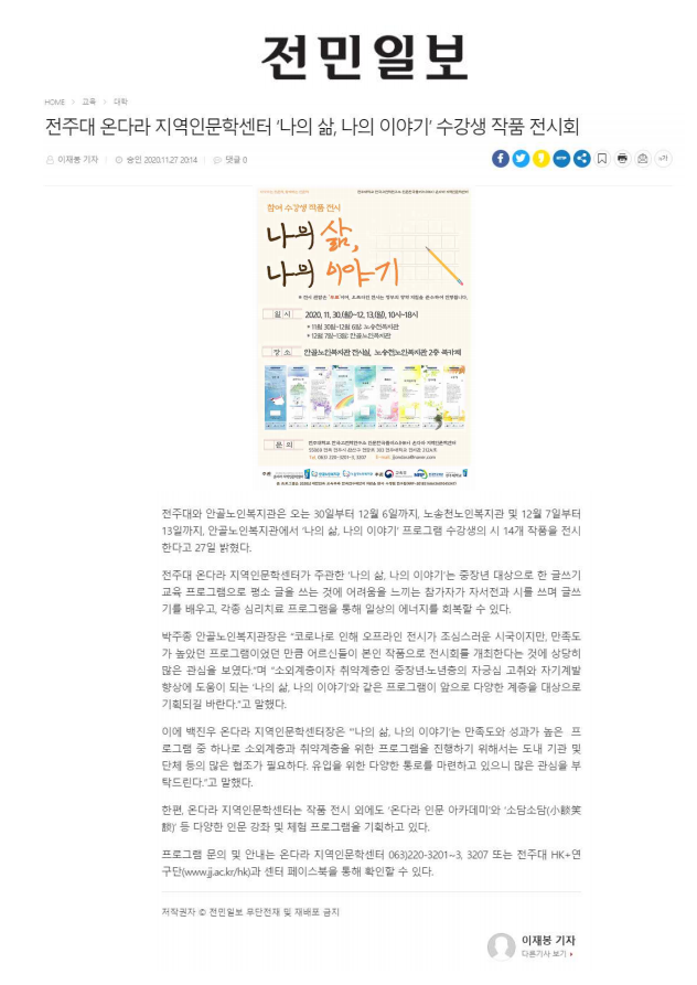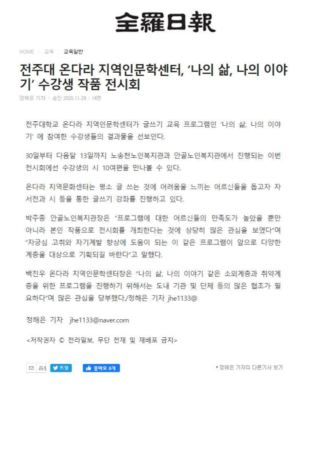 | 325 | 기타 | 전주대 온다라 지역인문학센터, '나의 삶, 나의 이야기' 수강생 작품 전시회 | 온다라 지역인문학센터 | 20-12-28 | 200 |