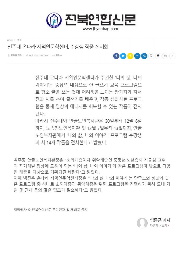 | 323 | 기타 | 전주대 온다라 지역인문학센터, '나의 삶, 나의 이야기' 수강생 작품 전시회 | 온다라 지역인문학센터 | 20-12-28 | 197 |