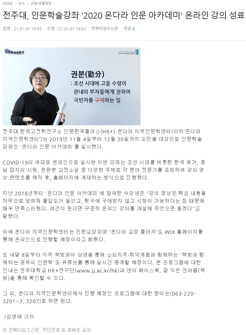 | 328 | 기타 | 전주대, 인문학술강좌 '2020 온다라 인문 아카데미' 온라인 강의 성료 | 온다라 지역인문학센터 | 21-01-12 | 199 |
