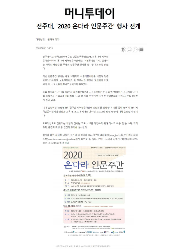 303 기타 전주대, '2020 온다라 인문주간' 행사 전개 온다라 지역인문학센터 20-10-23 217   201021_전주대, '2020 온다라 인문주간' 행사 전개_머니투데이.png