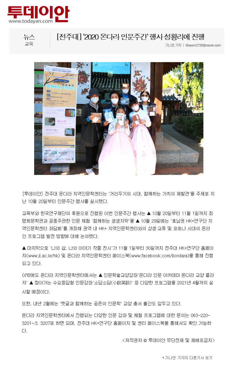 308 기타 [전주대] ‘2020 온다라 인문주간’ 행사 성황리에 진행 온다라 지역인문학센터 20-11-10 200   201105_[전주대] ‘2020 온다라 인문주간’ 행사 성황리에 진행_투데이안.png