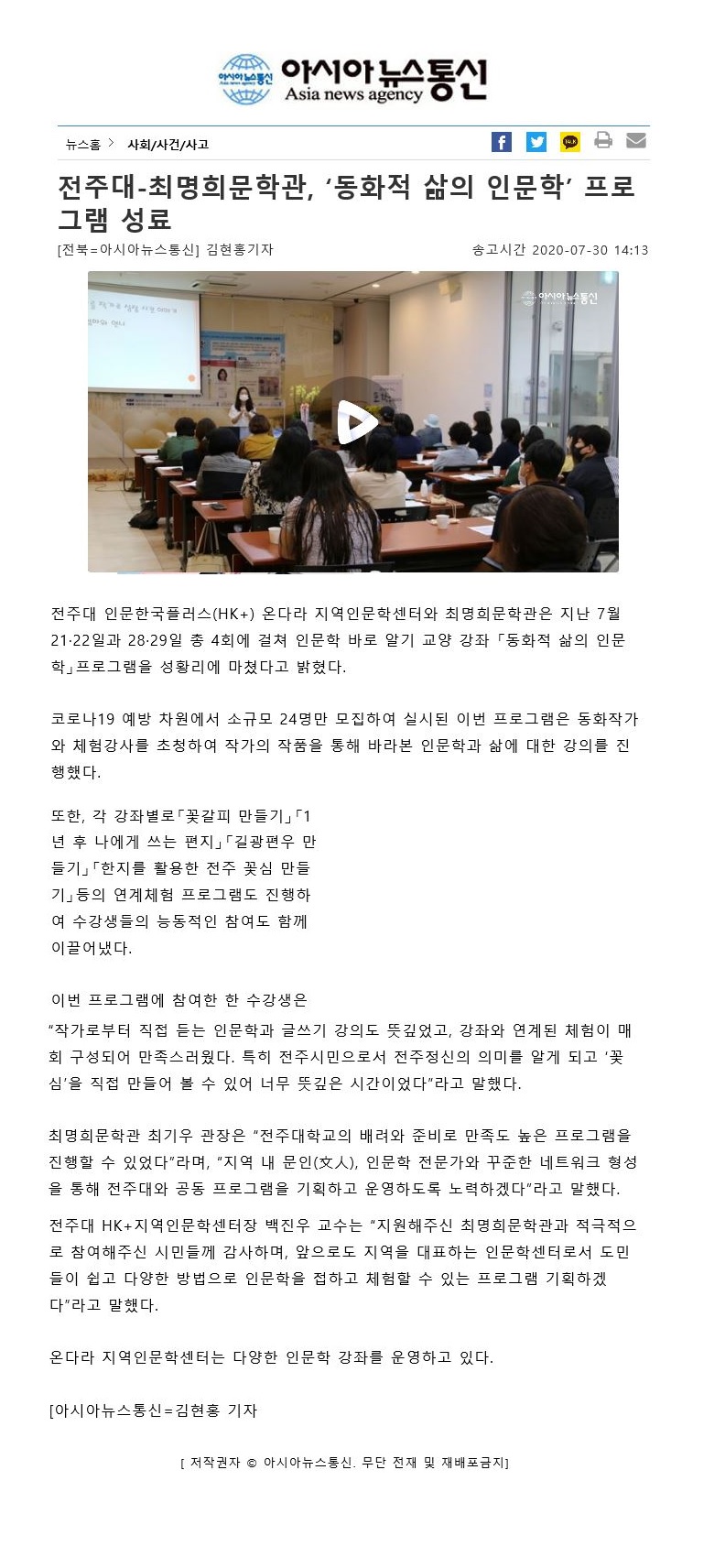 | 291 | 기타 | 전주대-최명희문학관 '동화적 삶의 인문학' 프로그램 성료 | 온다라 지역인문학센터 | 20-08-03 | 222 |
