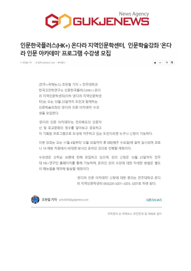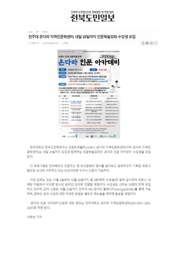 | 295 | 기타 | 전주대 온다라 지역인문학센터, 내달 23일까지 인문학술강좌 수강생 모집 | 온다라 지역인문학센터 | 20-10-16 | 203 |