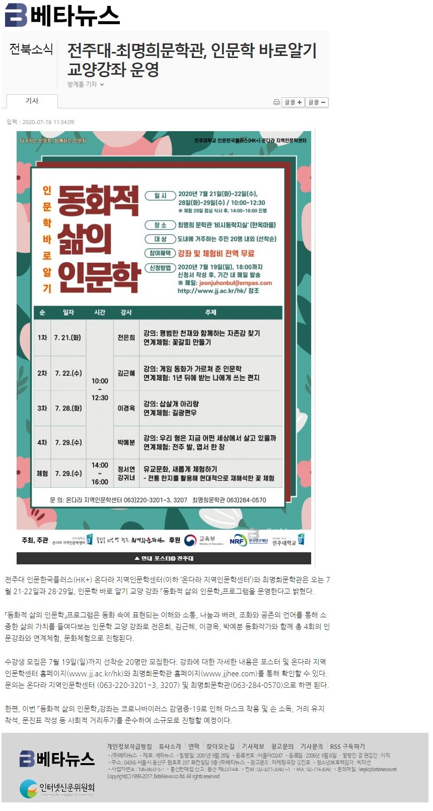 280 기타 전주대-최명희문학관 인문학 바로알기 교양강좌 운영 온다라 지역인문학센터 20-07-27 206   200716_전주대-최명희문학관, 인문학 바로알기 교양강좌 운영_베타뉴스.jpg