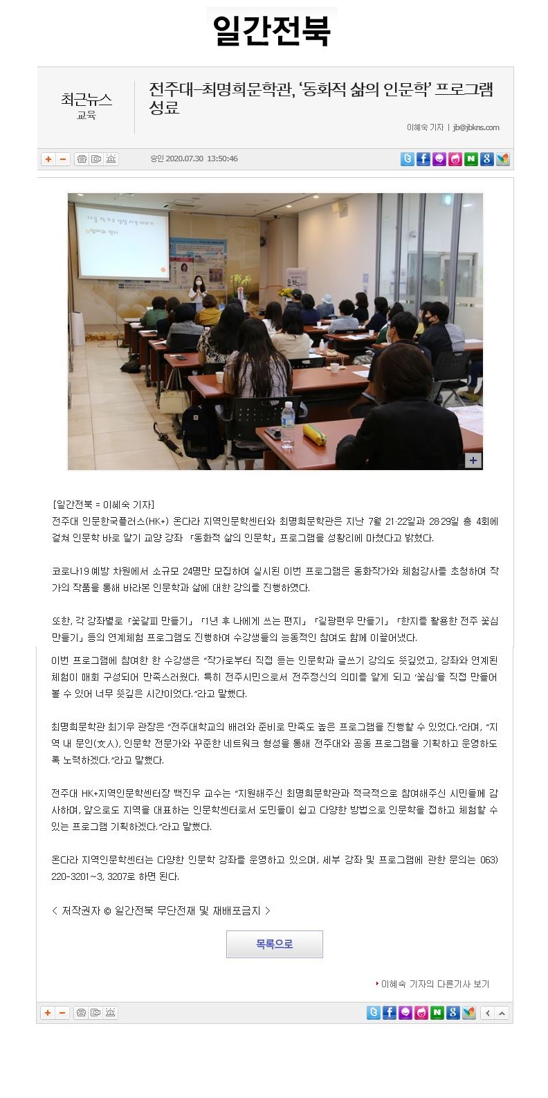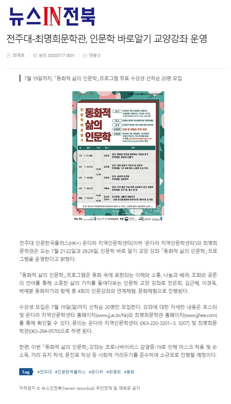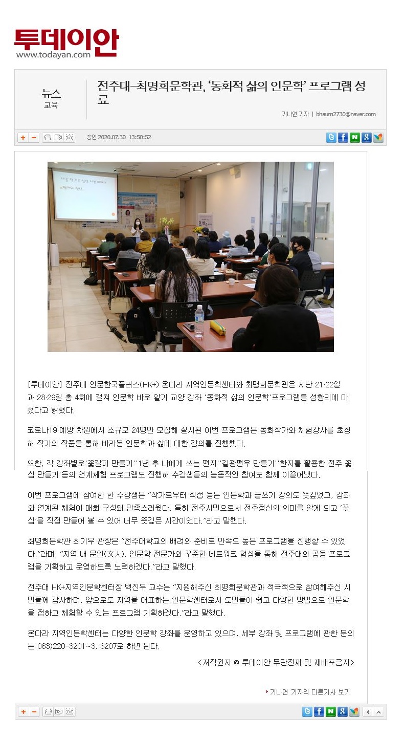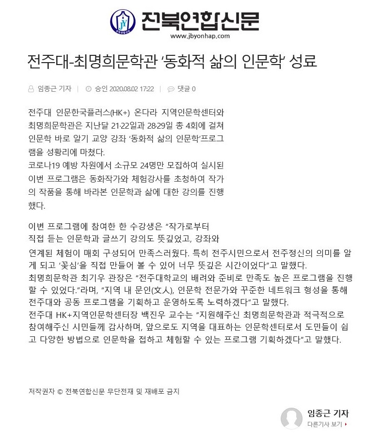 284 기타 전주대-최명희문학관 '동화적 삶의 인문학' 성료 온다라 지역인문학센터 20-08-03 233   200802_전주대-최명희문학관 '동화적 삶의 인문학' 성료_전북연합신문.jpg